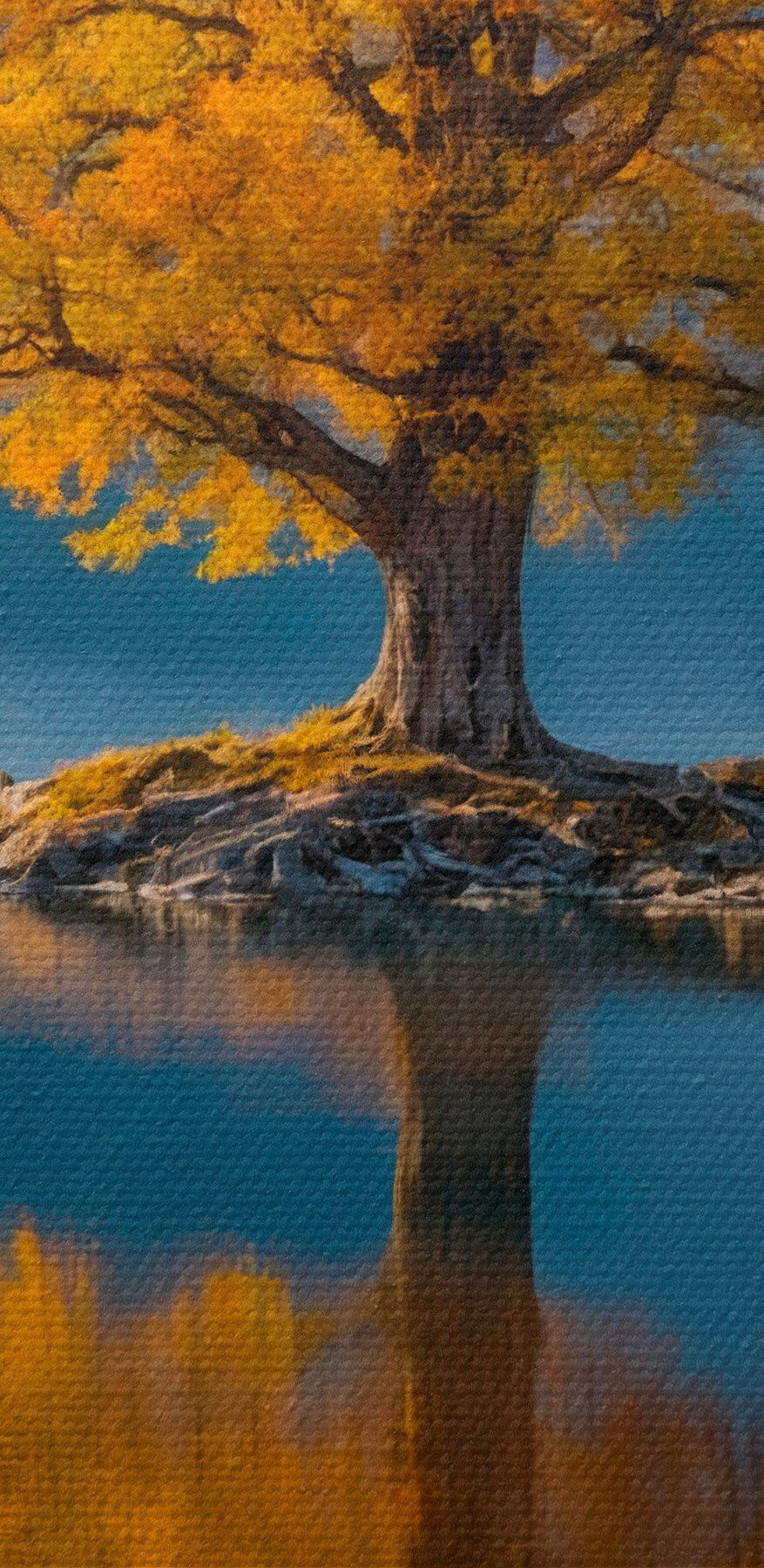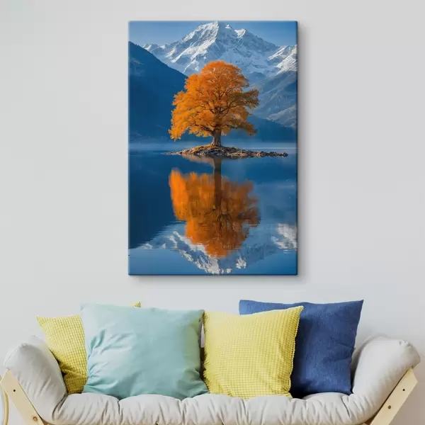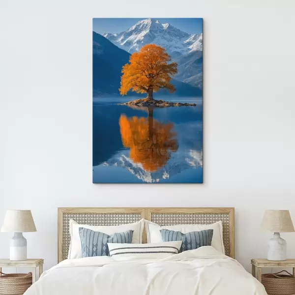 Paveikslas Medis ežero viduryje kalnų fone Nr s41585