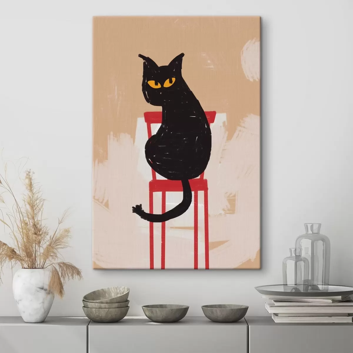 Paveikslas Juoda katė, sėdinti ant raudonos kėdės smėlio spalvos fone, šiurkštūs potėpiai, tapybos imitacija Nr s41612