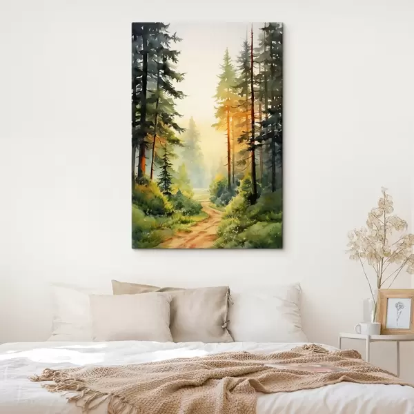 Paveikslas Gražus akvarelinis miškas su pušimis ir švelnia saulės šviesa Nr s41637