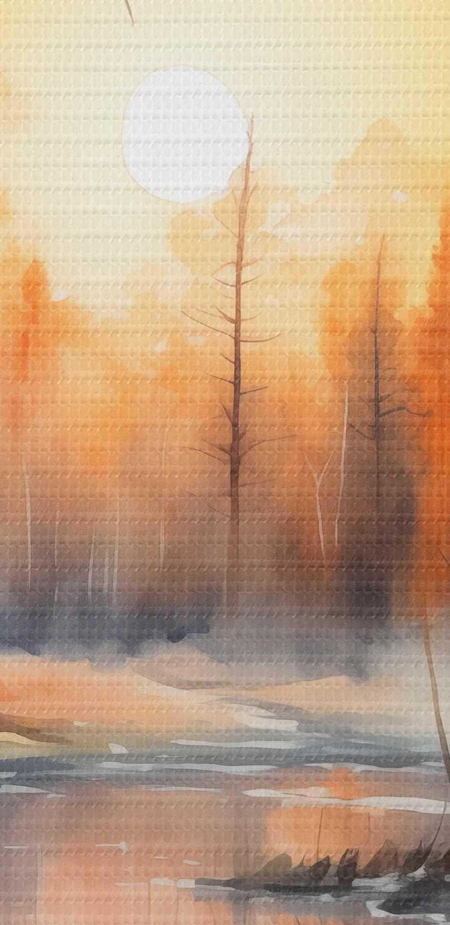 Paveikslas Ežeras miške, akvarelė, rudens spalvos, rūkas, saulėlydžio dangus Nr s41642
