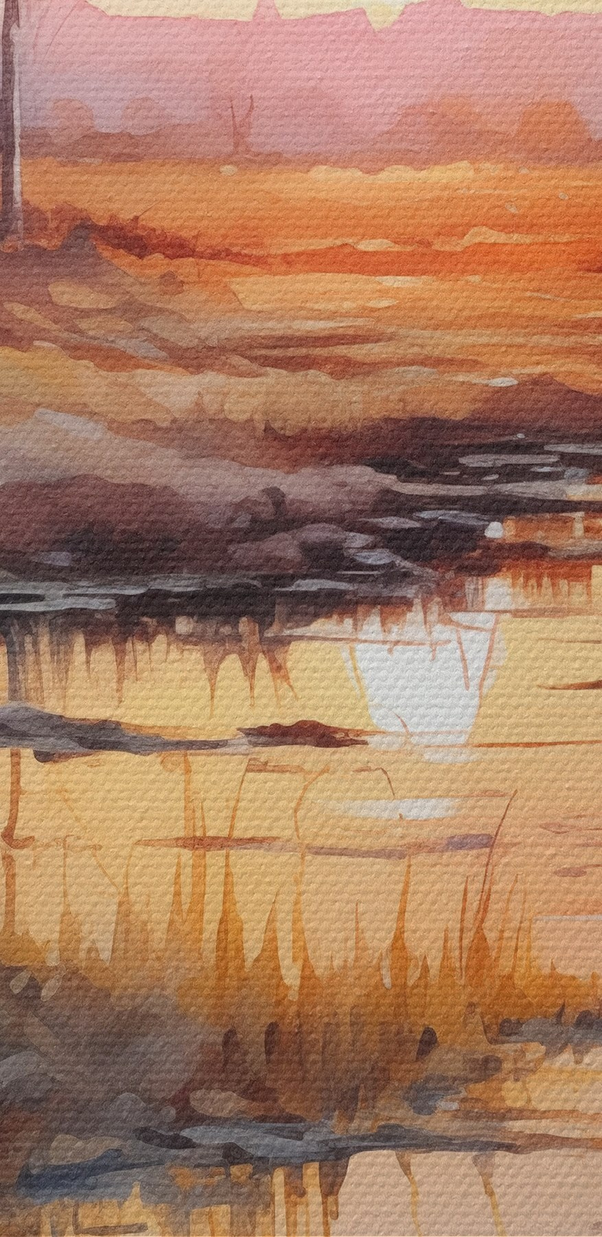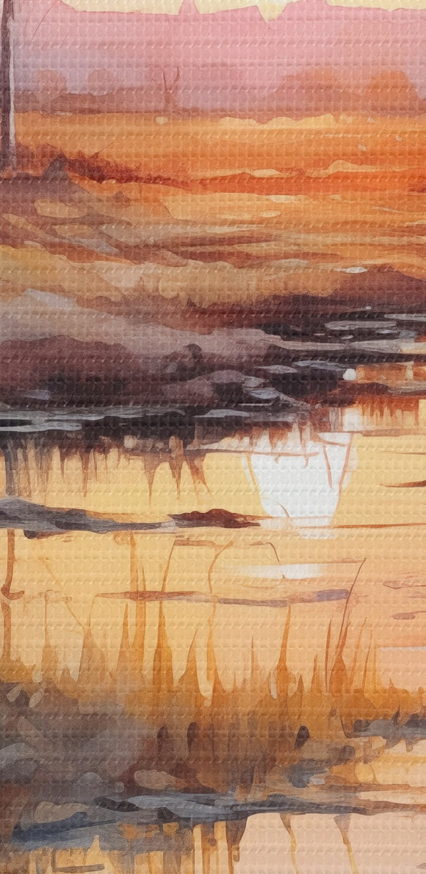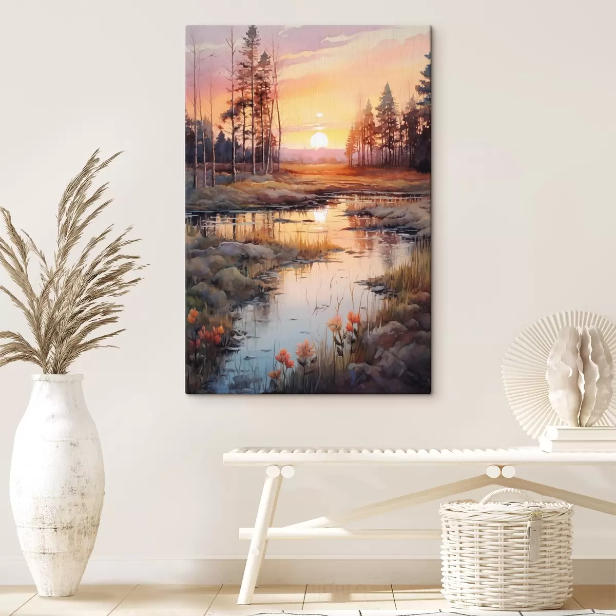 Paveikslas Graži upė rudens miške, akvarelė, pieva, saulėlydžio dangus Nr s41643