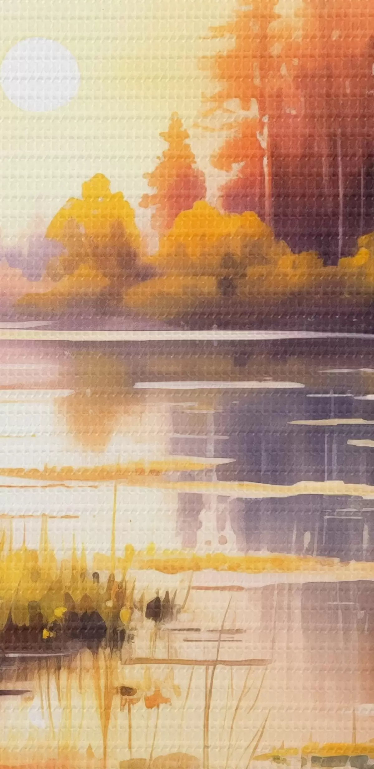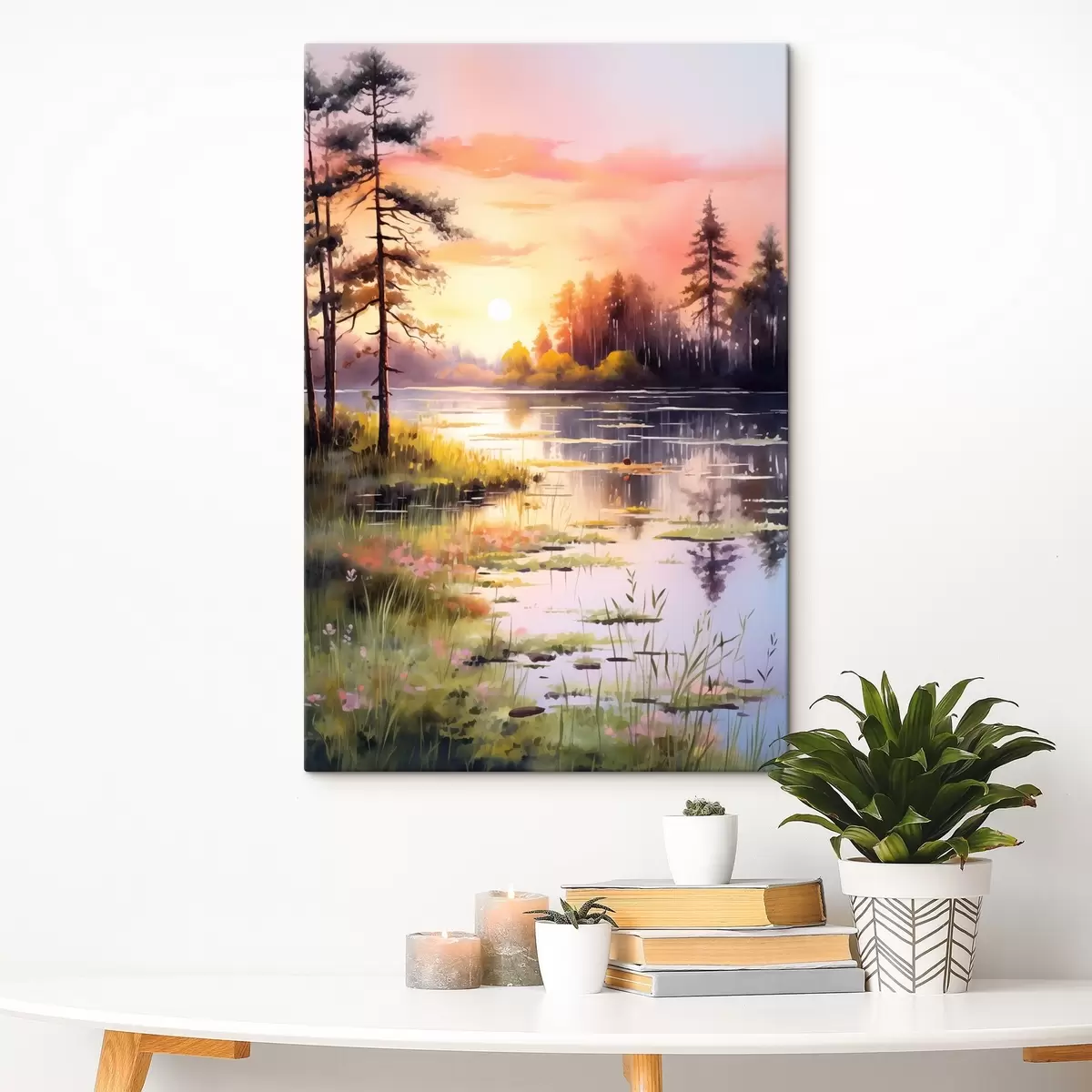 Paveikslas Saulėtekis miško ežere, akvarelė, medžiai, gėlės, švelni šviesa Nr s41644