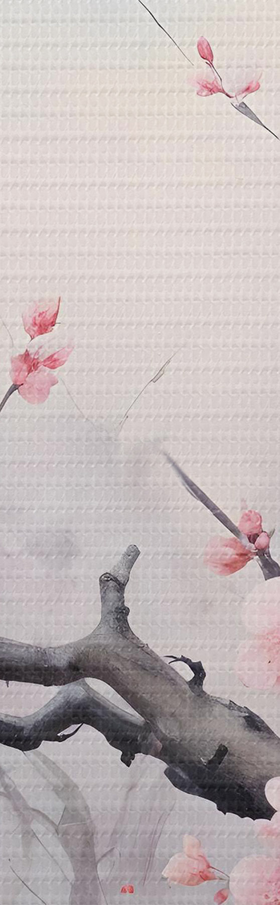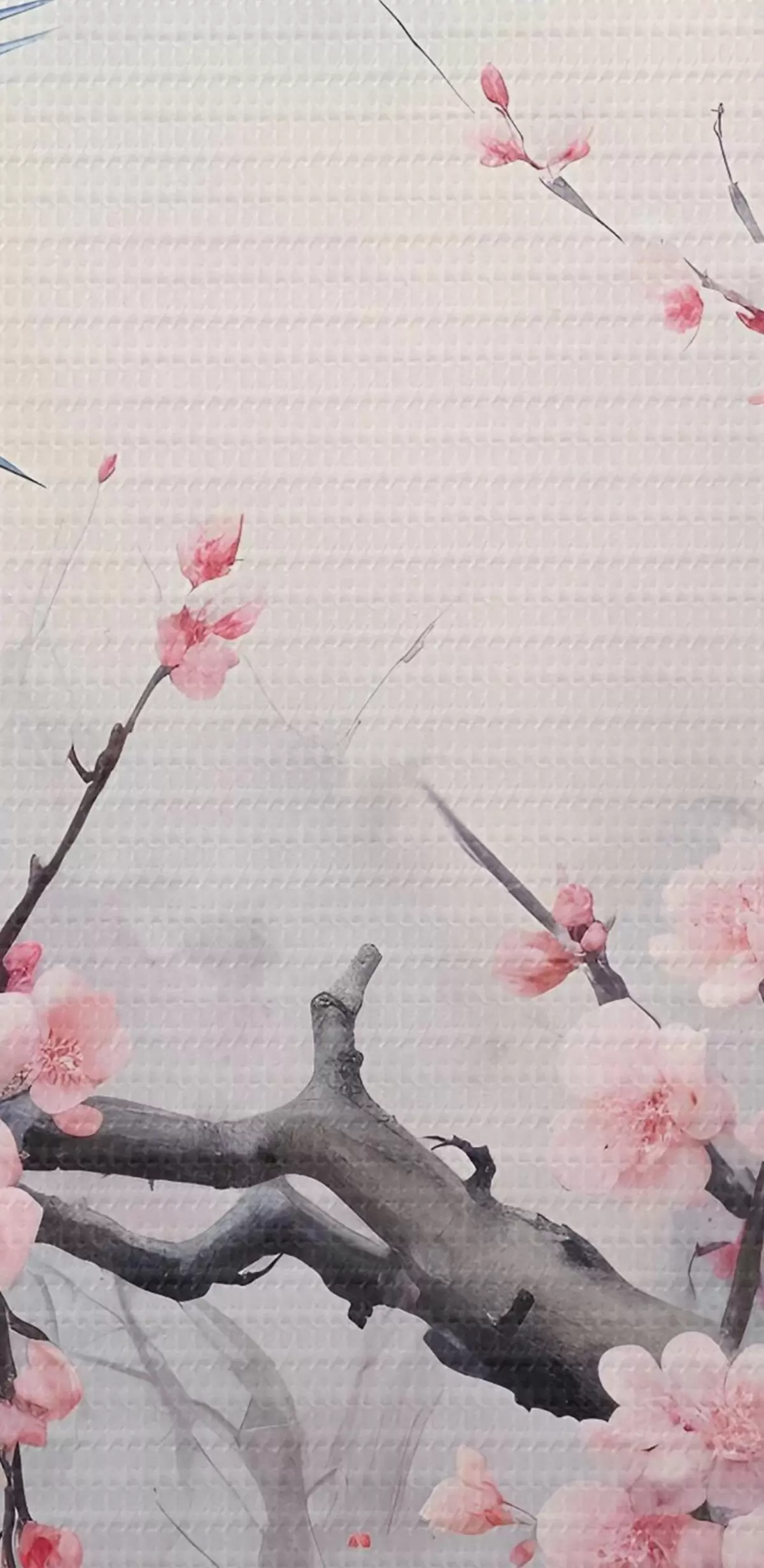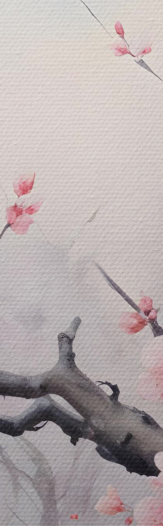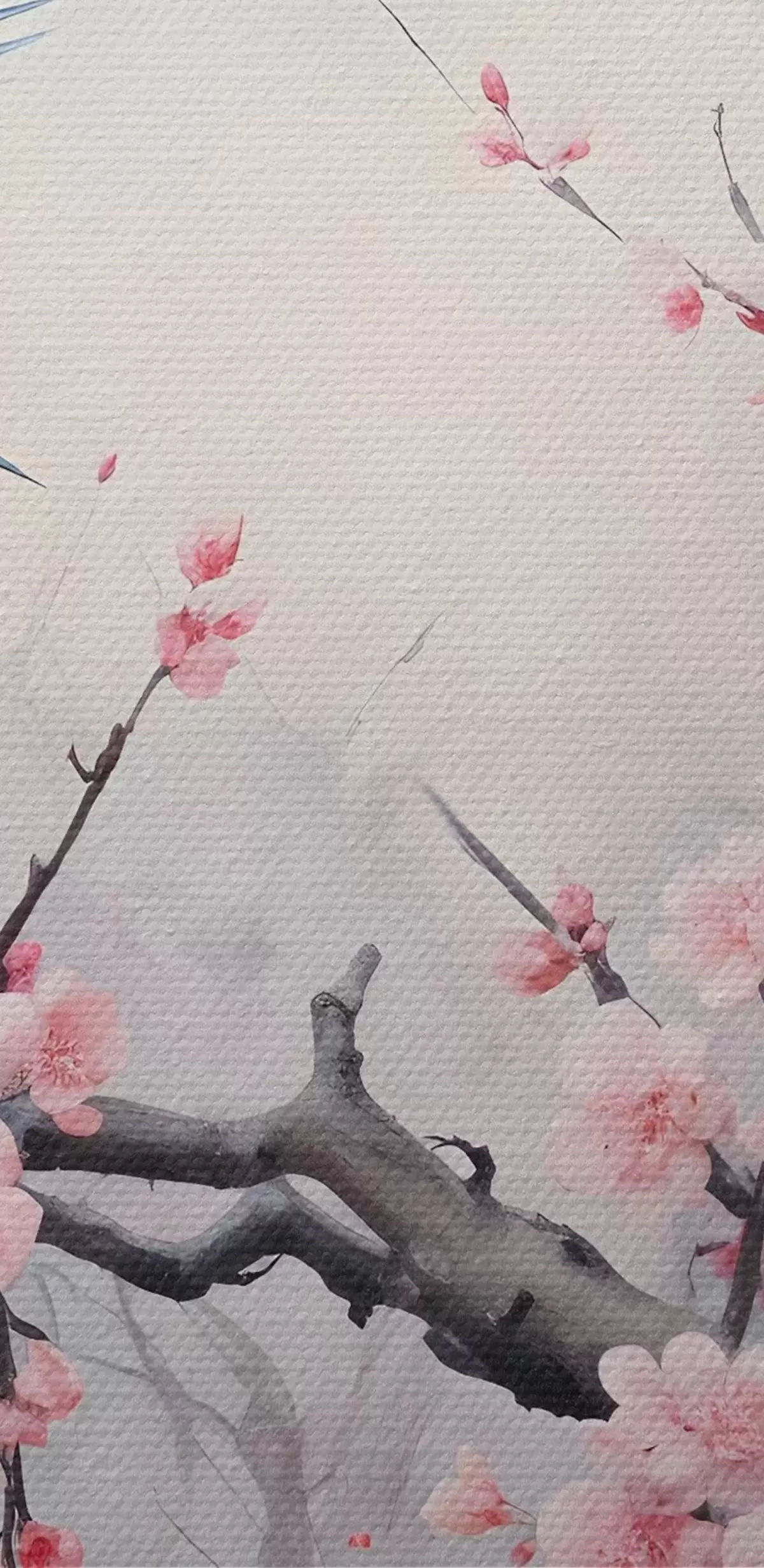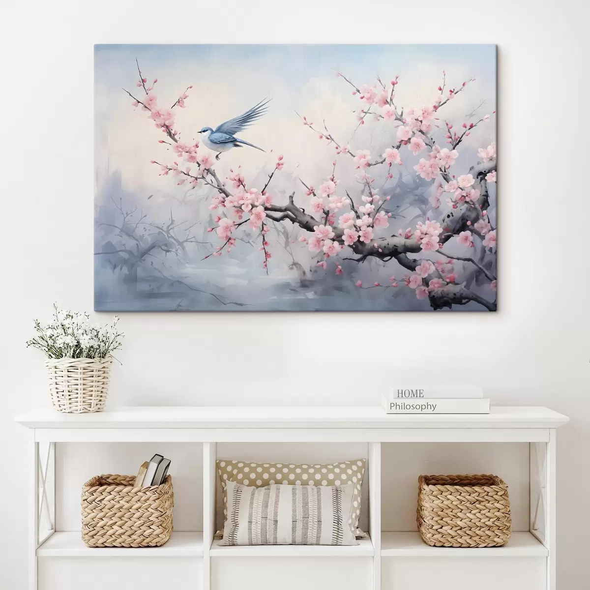 Paveikslas Mėlynas paukštis, skrendantis tarp rausvų vyšnių žiedų migloto pavasario prislopintame fone Nr s41712