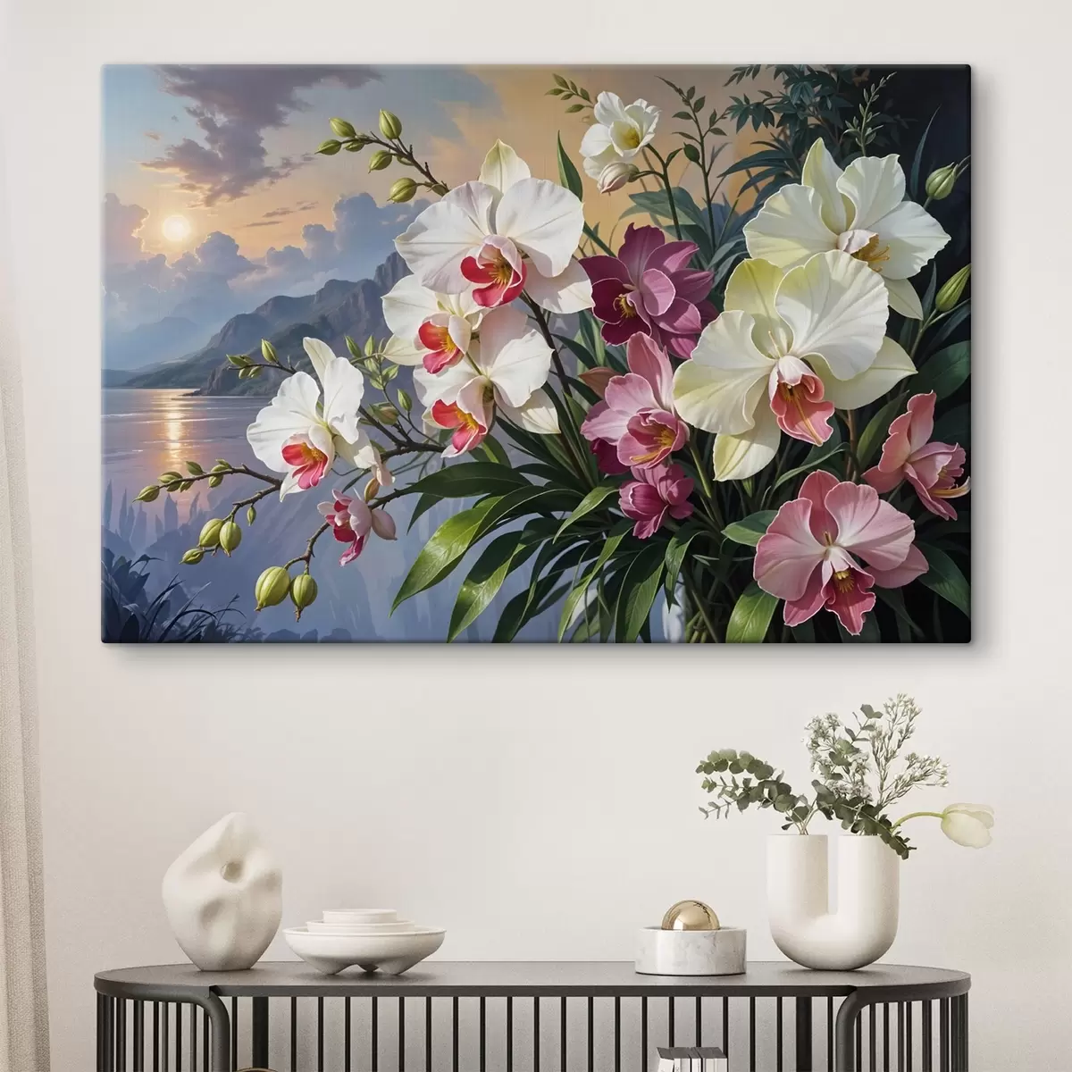 Paveikslas Ryški atogrąžų gėlių puokštė su orchidėjomis ir sodria žalia lapija jūros peizažo fone Nr s41713