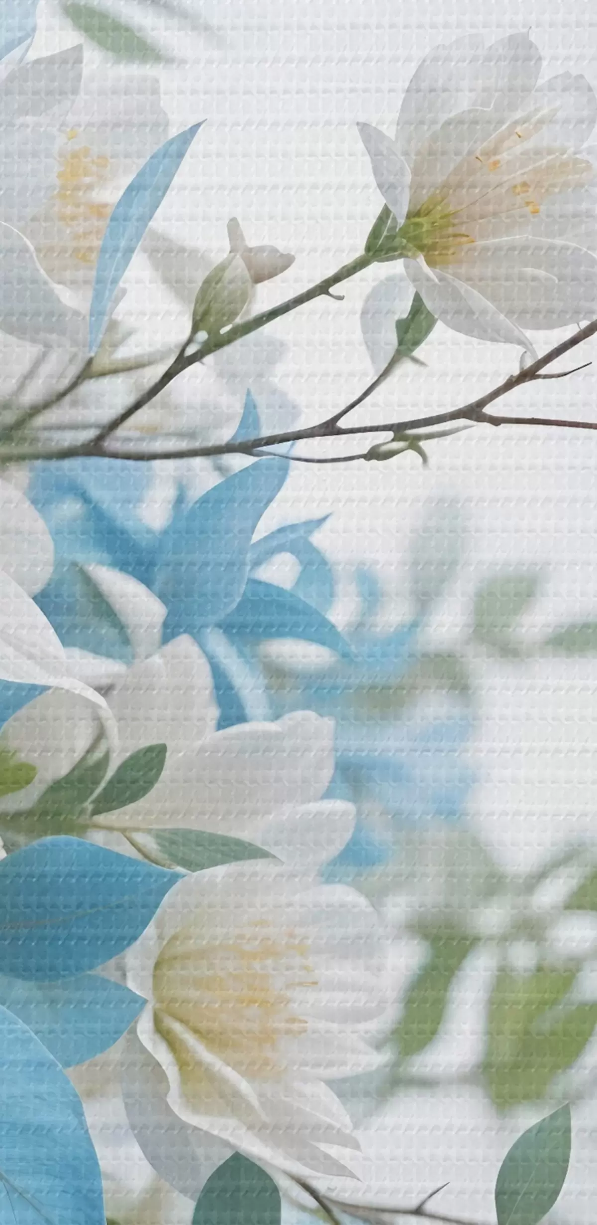 Paveikslas Baltų ir mėlynų gėlių puokštė su žaliais lapais švelniame, neryškiame fone Nr s41715
