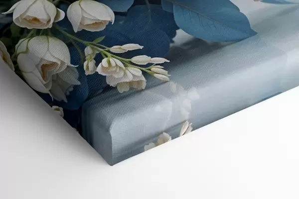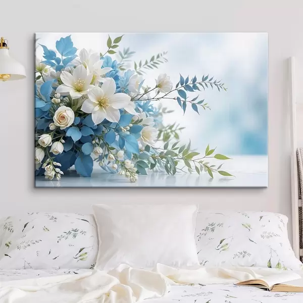 Paveikslas Baltų ir mėlynų gėlių puokštė su žaliais lapais švelniame, neryškiame fone Nr s41715