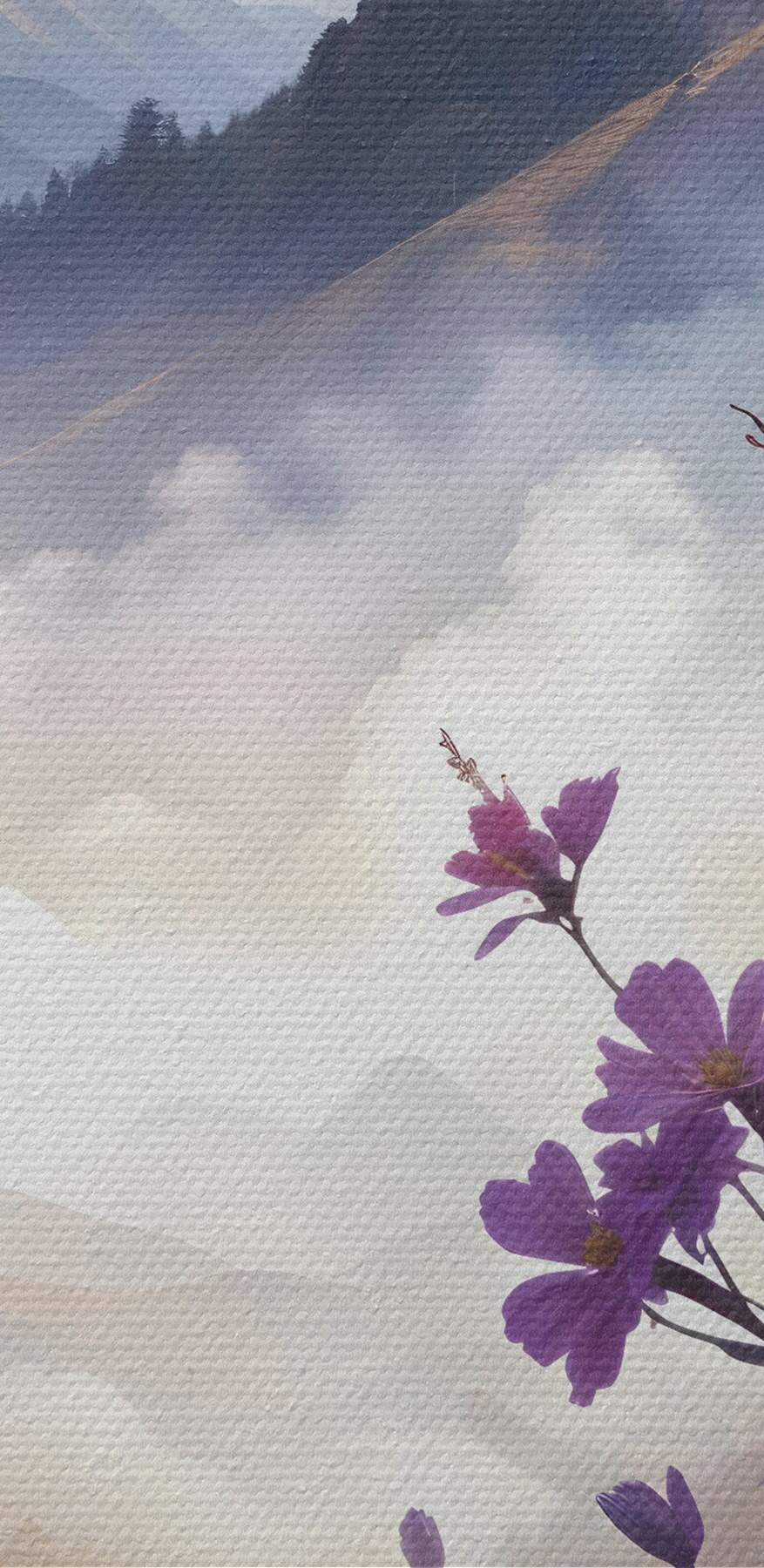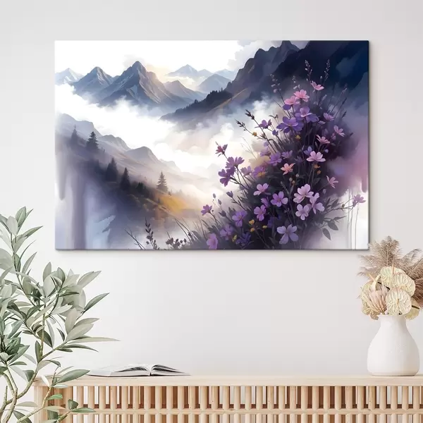 Paveikslas Peizažas su kalnų grandine fone, apsuptas sodrių violetinių gėlių pirmame plane Nr s41724