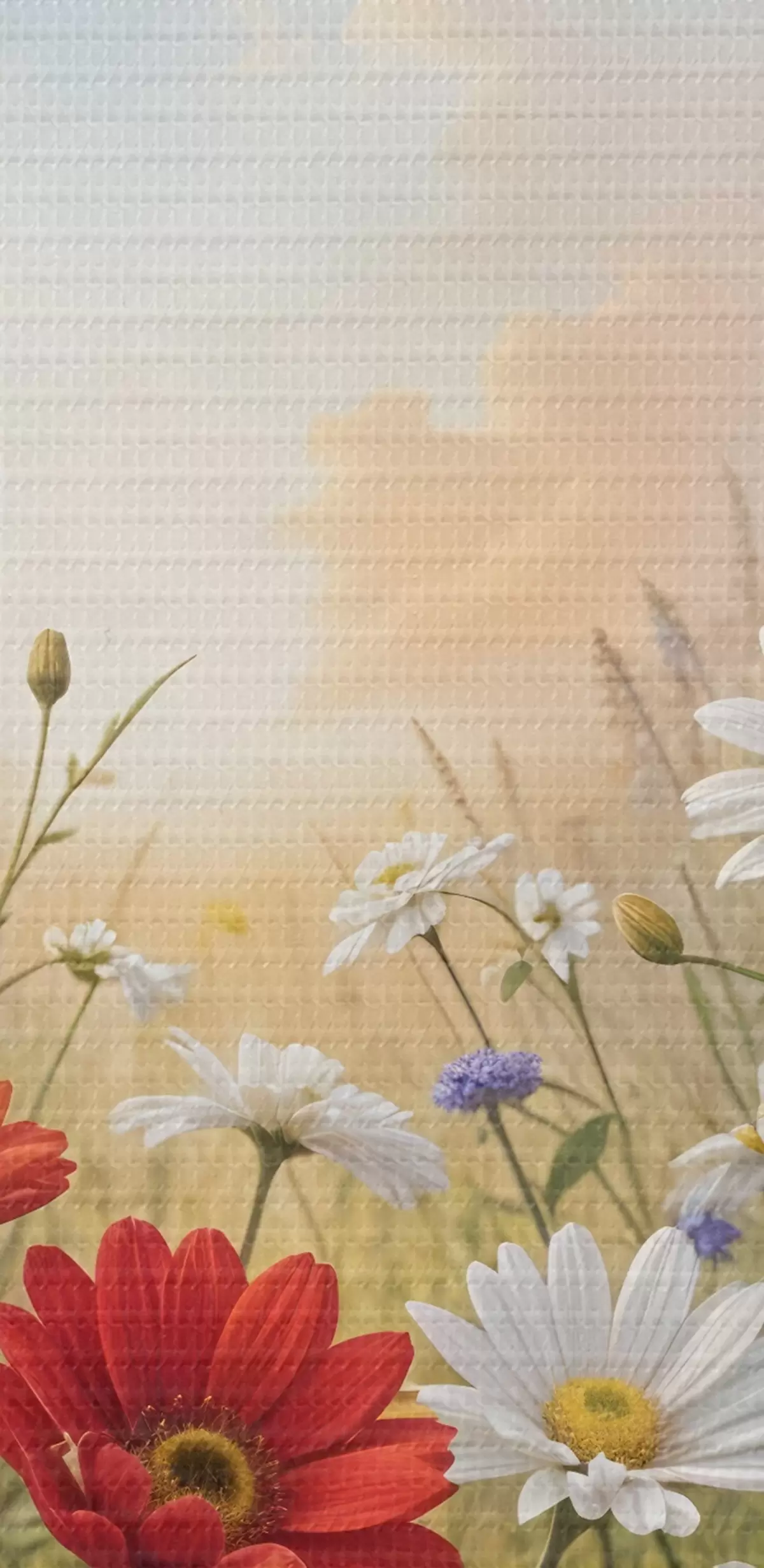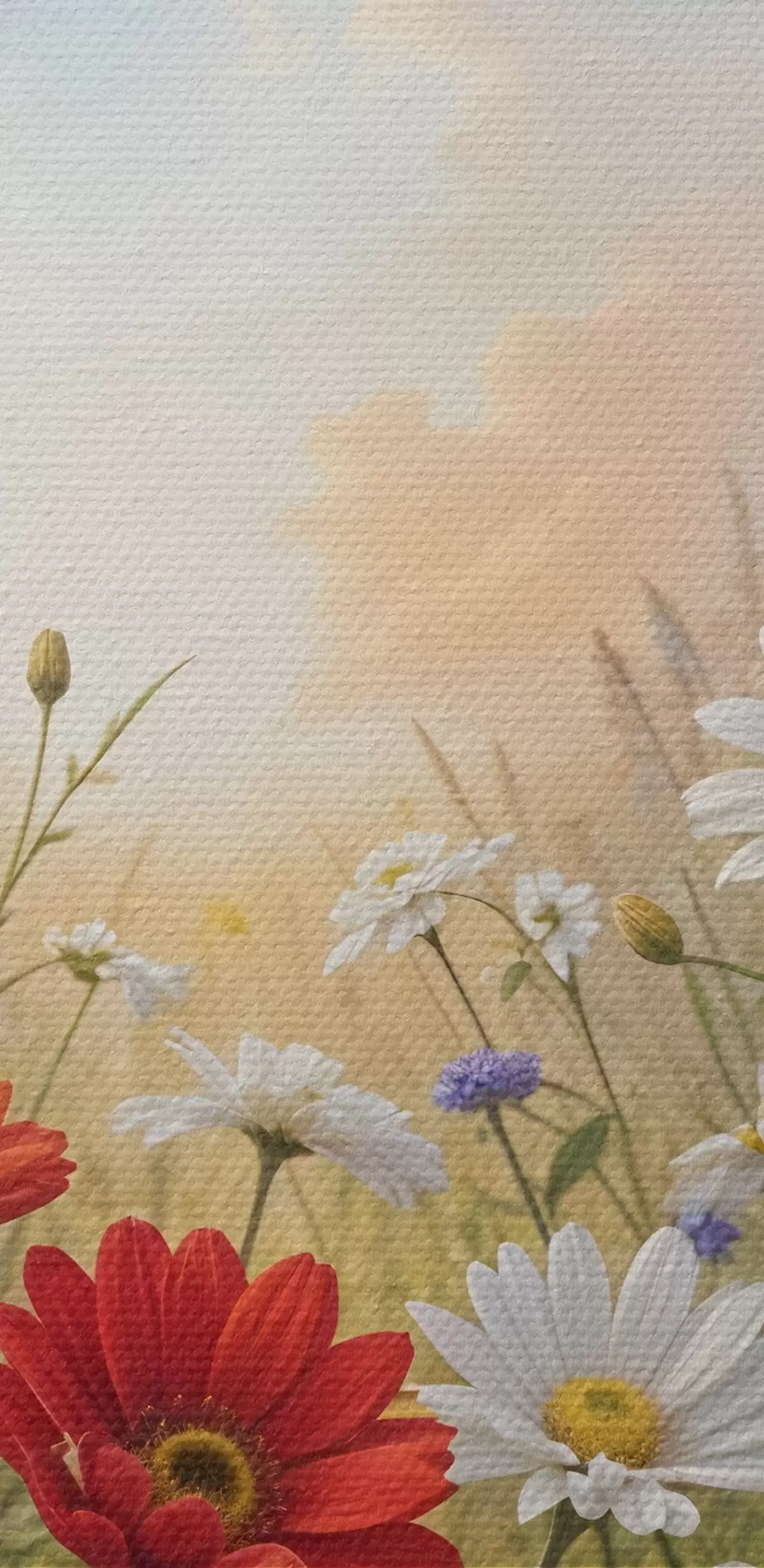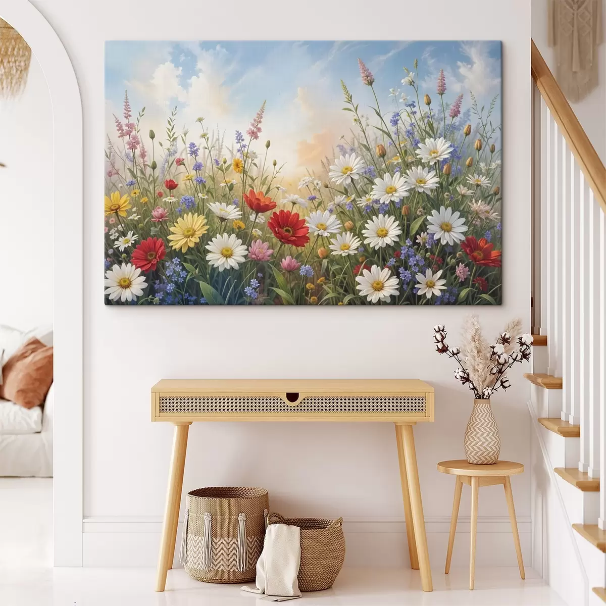 Paveikslas Spalvingas laukinių gėlių laukas, kuriame žydi saulutės, aguonos ir kiti augalai mėlyno dangaus fone Nr s41725