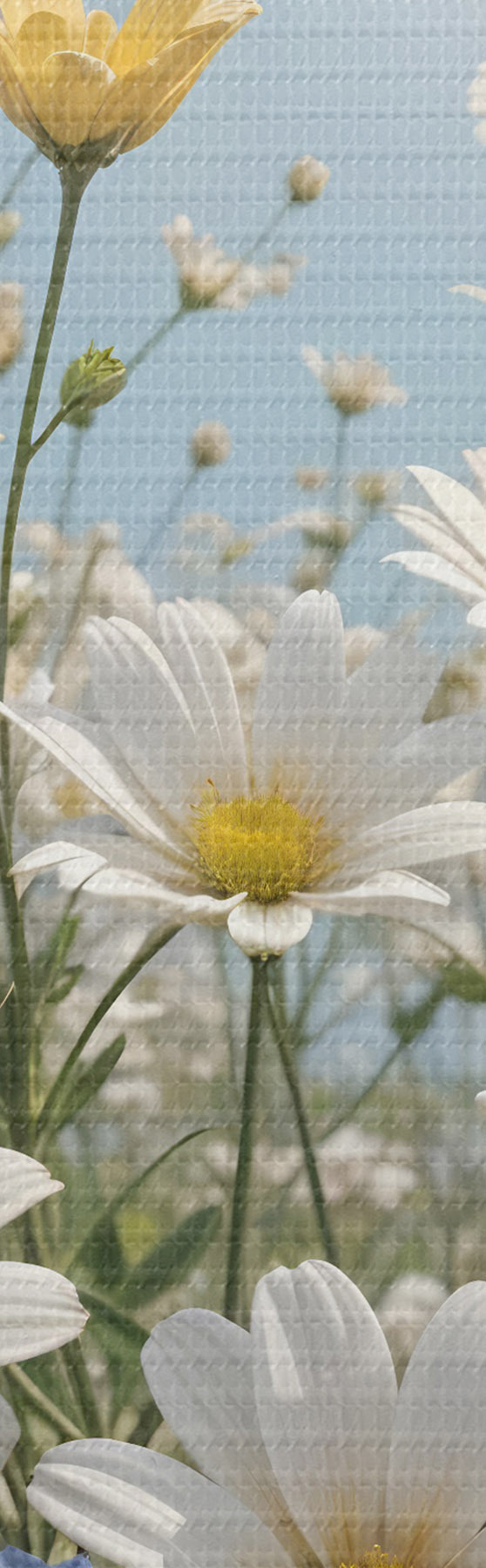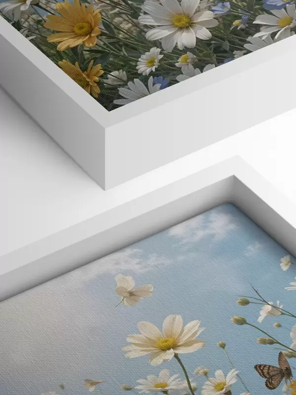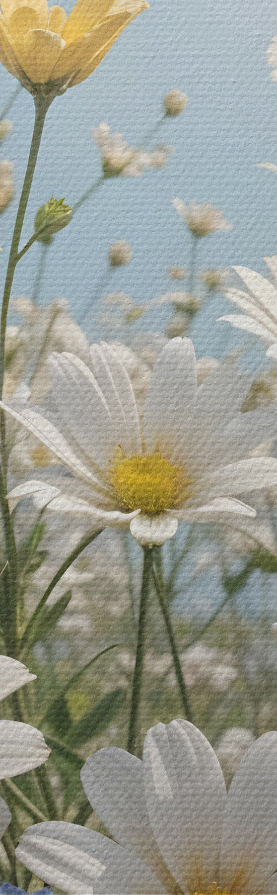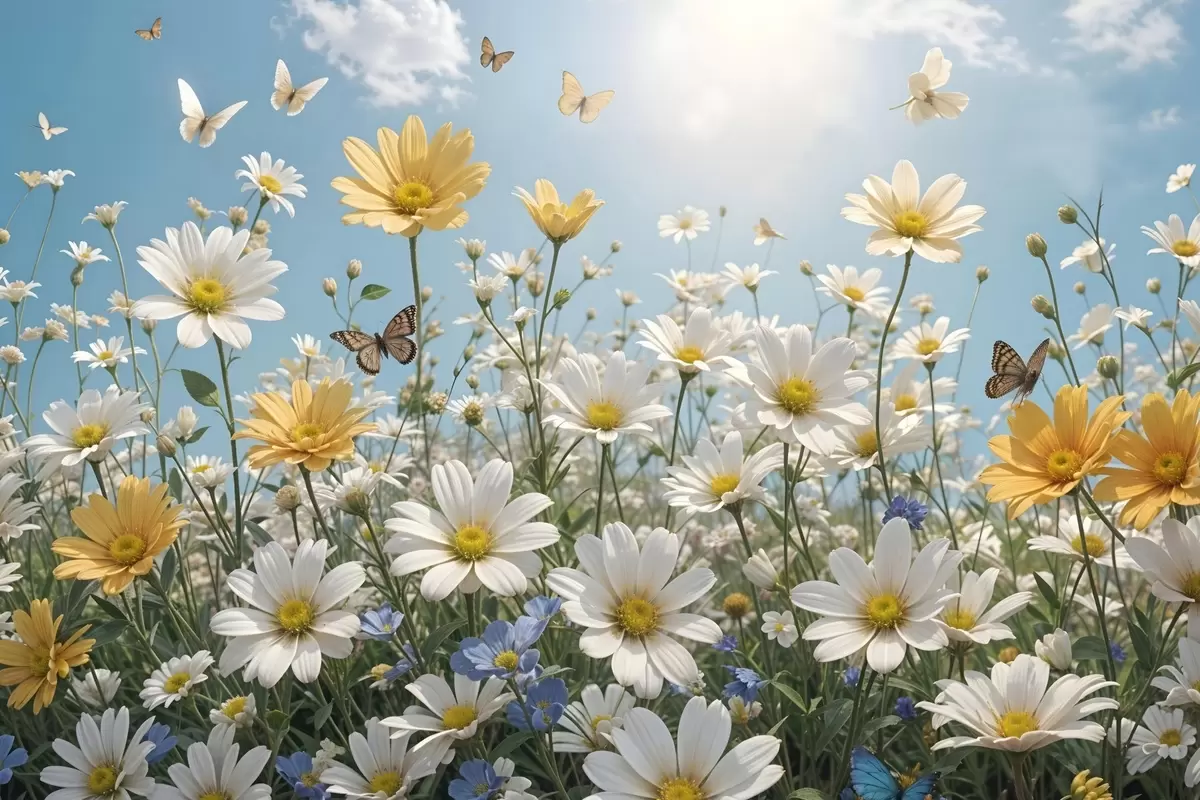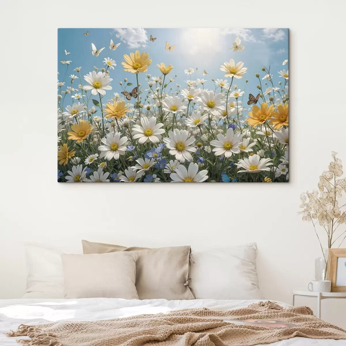 Paveikslas Baltų ir geltonų margučių laukas mėlyno dangaus fone su puriais baltais debesėliais ir virš jų skraidančiais drugeliais Nr s41726