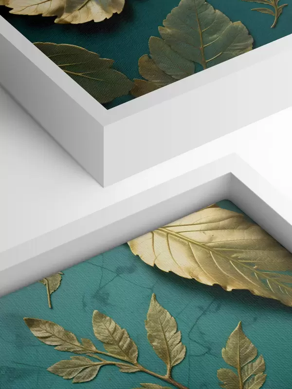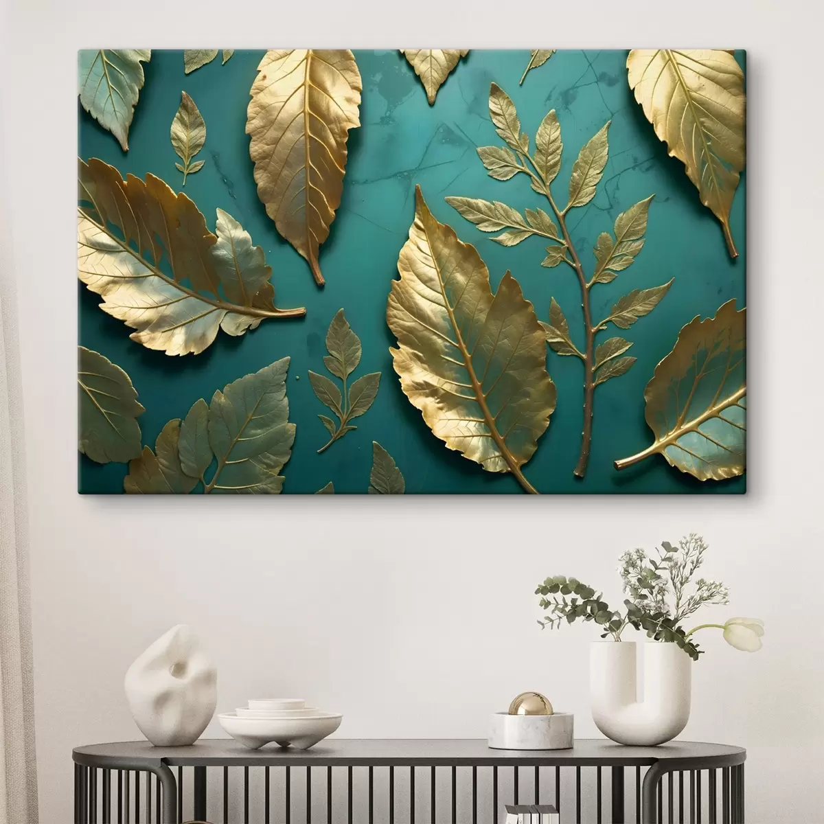 Paveikslas Geltoni subtilūs lapai ant arbatinės spalvos fono, sukuriantys elegantišką botaninį atspaudą Nr s41727