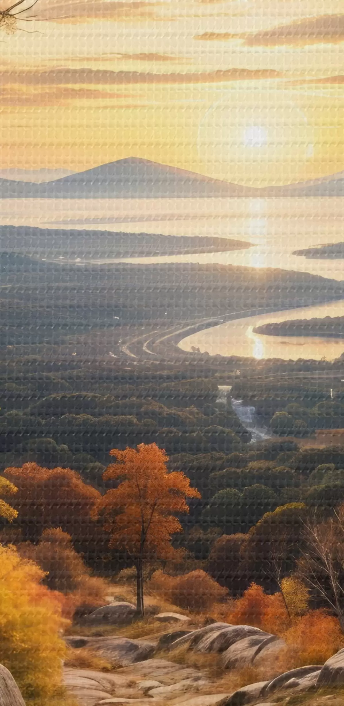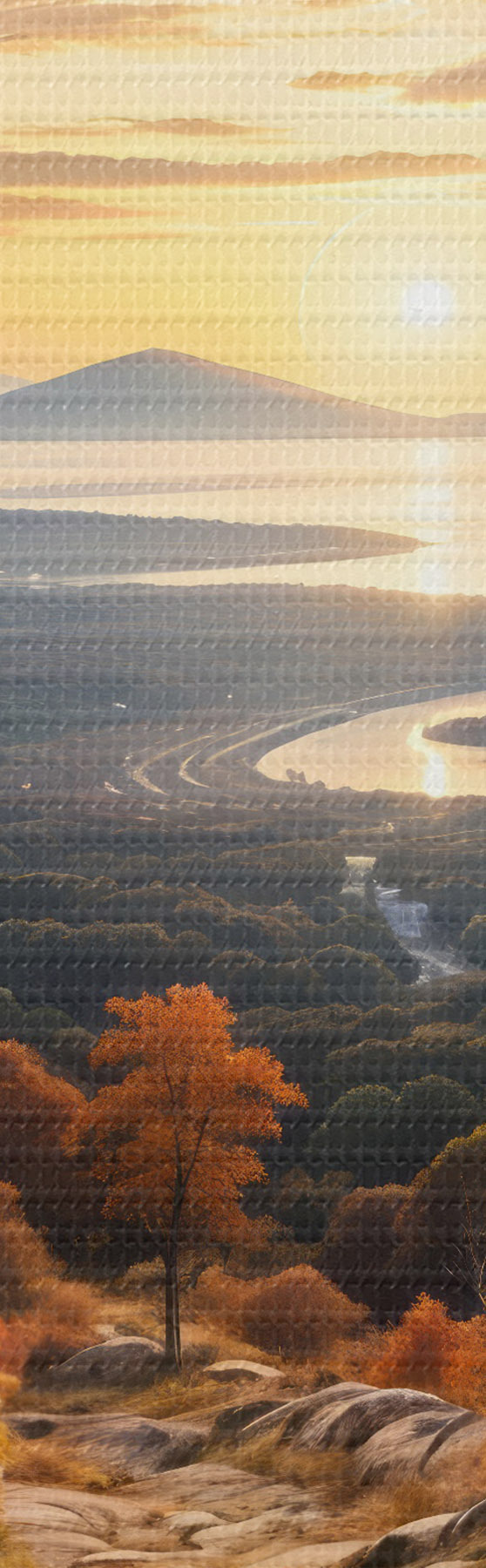 Paveikslas Kraštovaizdis su vingiuojančiu purvinu keliu, vedančiu per rudens spalvos medžių mišką ir saulėlydžio dangų Nr s41732