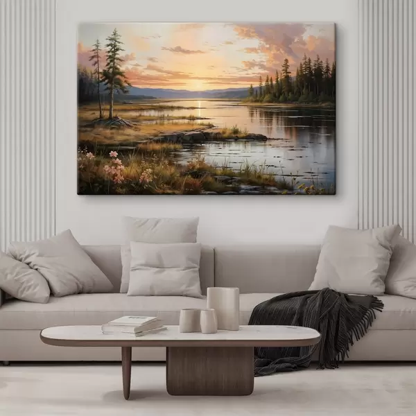 Paveikslas Ramus kraštovaizdis su ežeru, apsuptu pušų ir atspindinčiu šiltas saulėlydžio dangaus spalvas Nr s41733