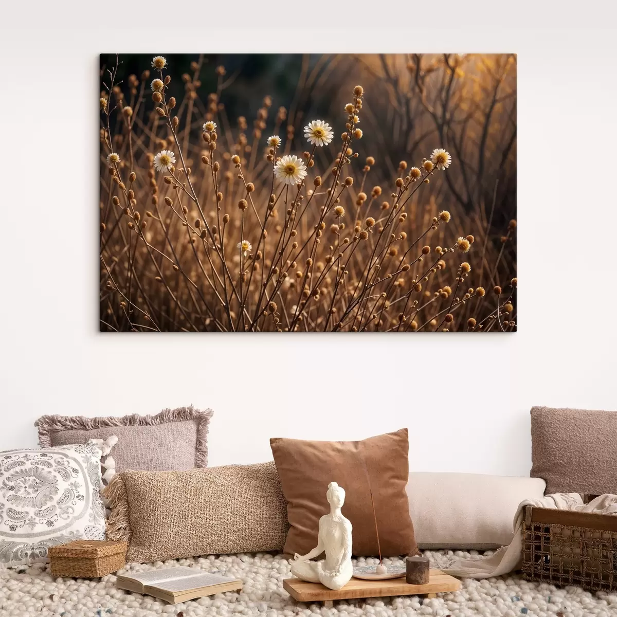 Paveikslas Balti margučiai išdžiūvusios žolės ir stiebų lauke, šviečiant šiltiems vakaro saulės spinduliams Nr s41735