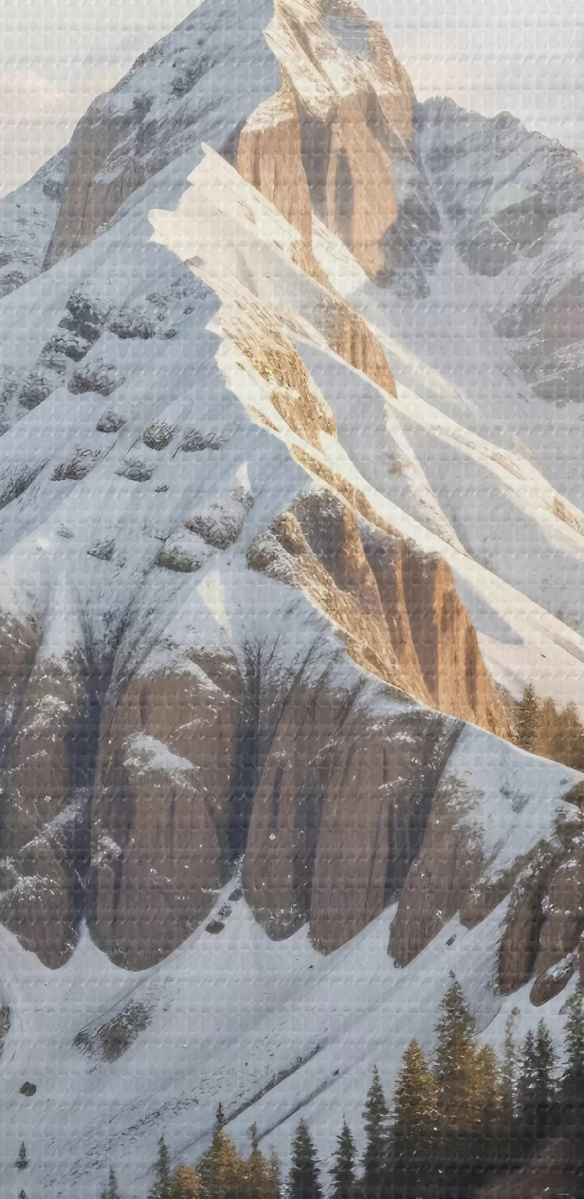 Paveikslas Snieguota kalno viršūnė, iškilusi virš miškingo kraštovaizdžio, pirmame plane - pušys Nr s41736