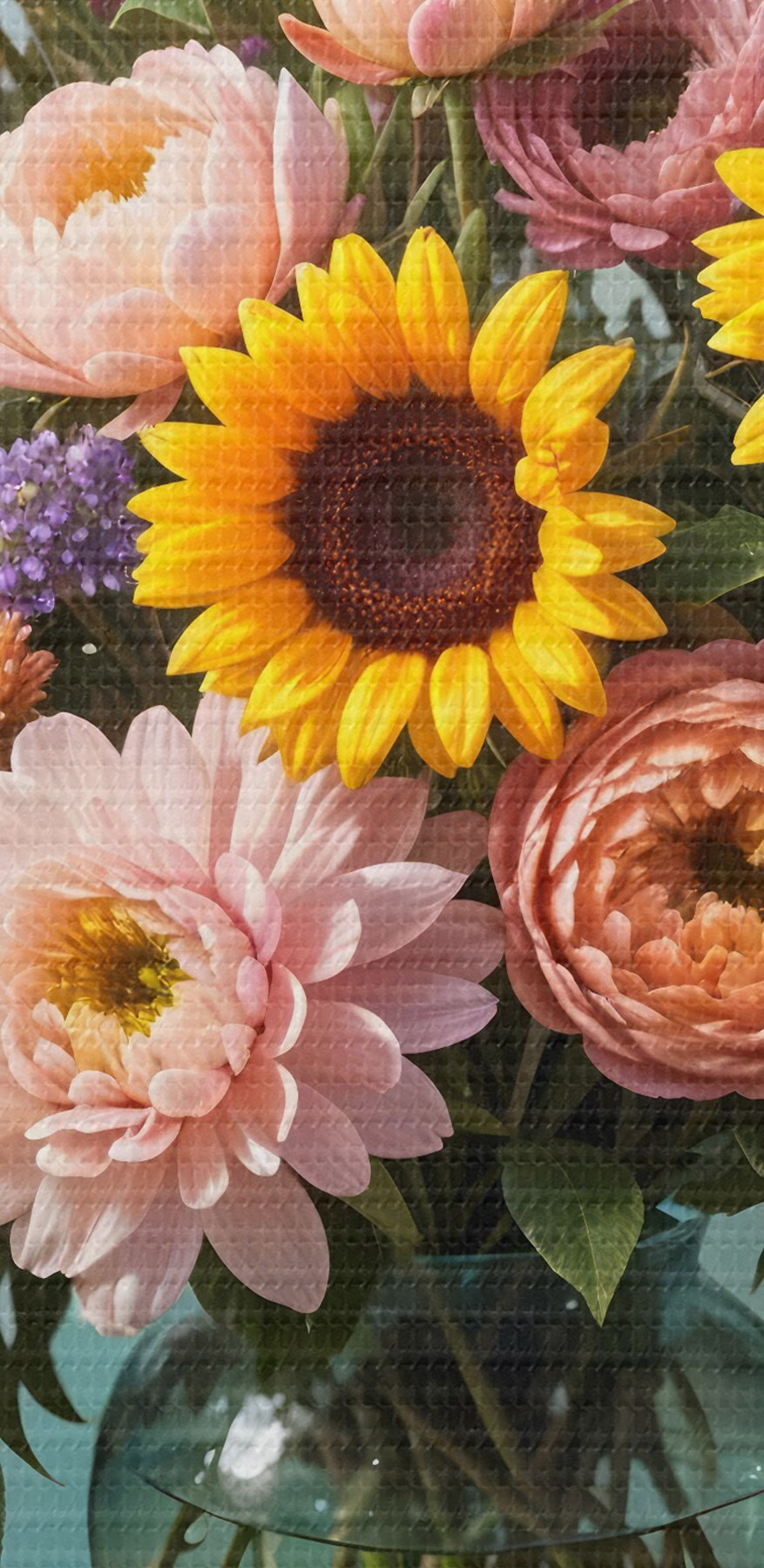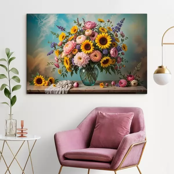 Paveikslas Didelė puokštė spalvingų gėlių, įskaitant saulėgrąžas, bijūnus, margučius ir levandas, stiklinėje vazoje Nr s41738