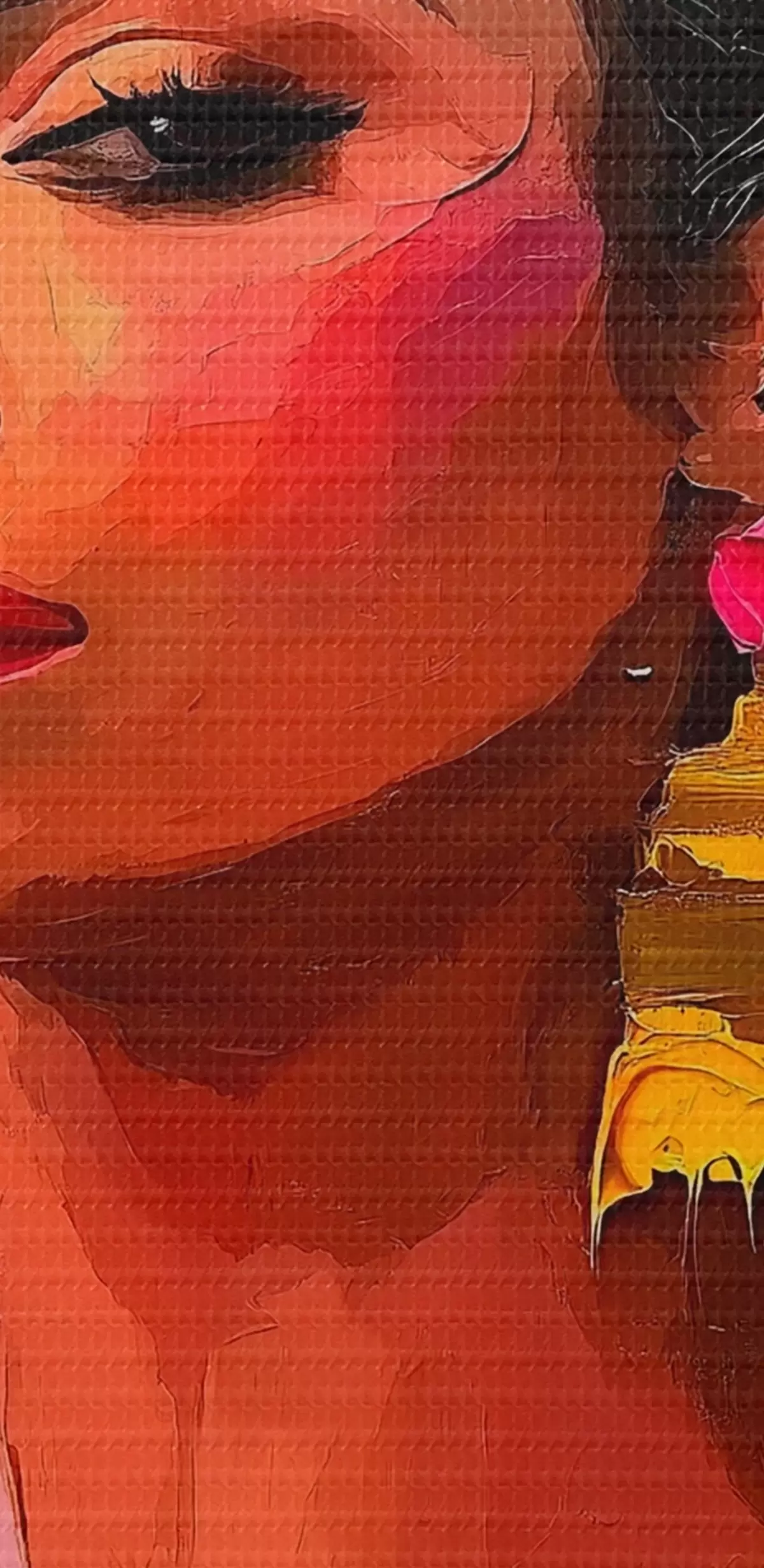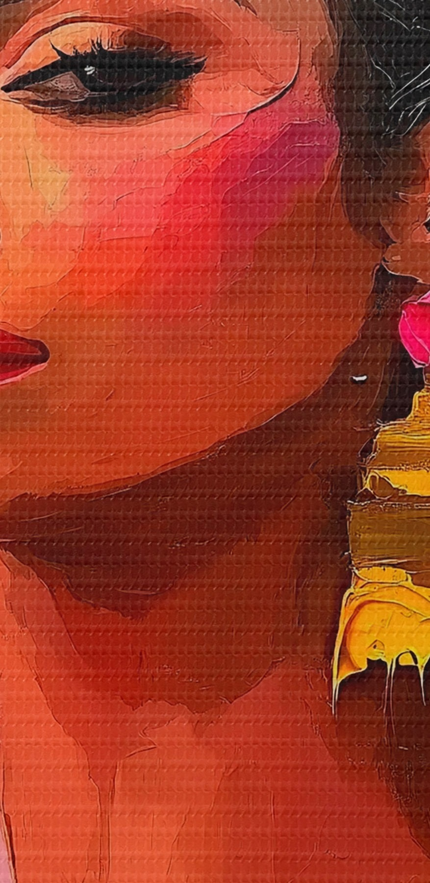 Paveikslas Moteris, pasipuošusi ryškiu gėlių vainiku spalvingame fone Nr s41809