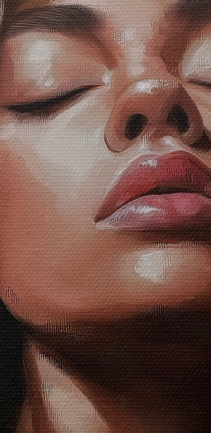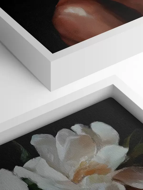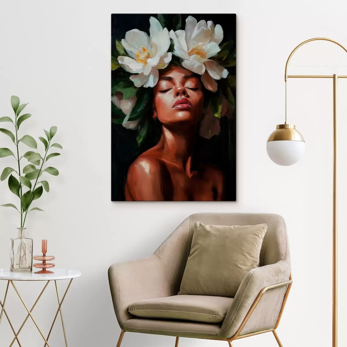 Paveikslas Moters portretas su baltomis gėlėmis plaukuose tamsiame fone Nr s41824