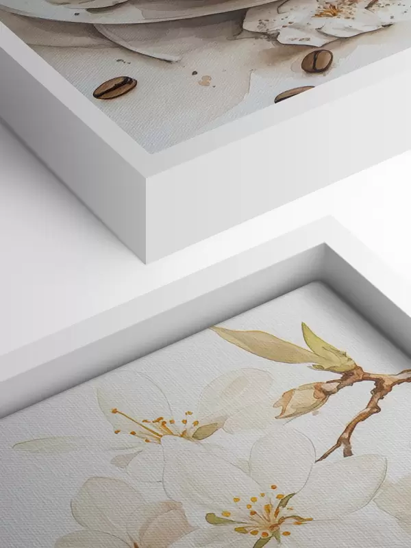 Paveikslas Puodelis kavos su makaronais, akvarelės stilius, švelnios spalvos, jazminų gėlės Nr s41949