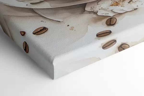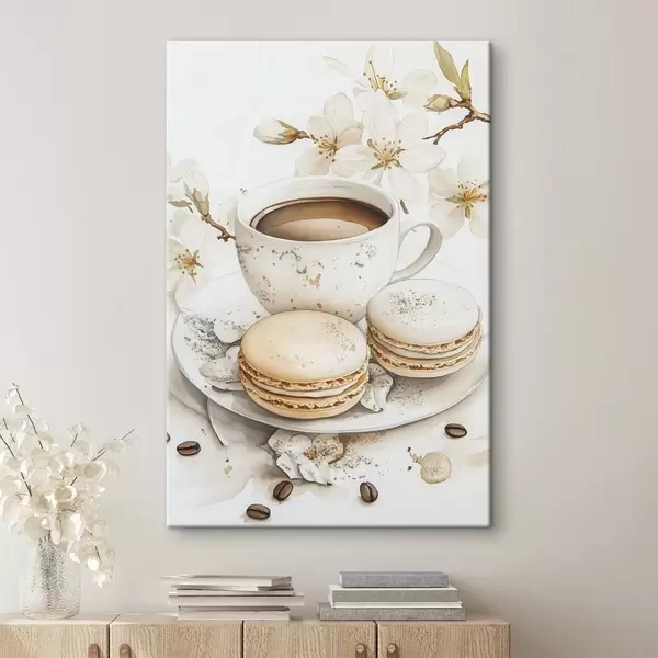 Paveikslas Puodelis kavos su makaronais, akvarelės stilius, švelnios spalvos, jazminų gėlės Nr s41949