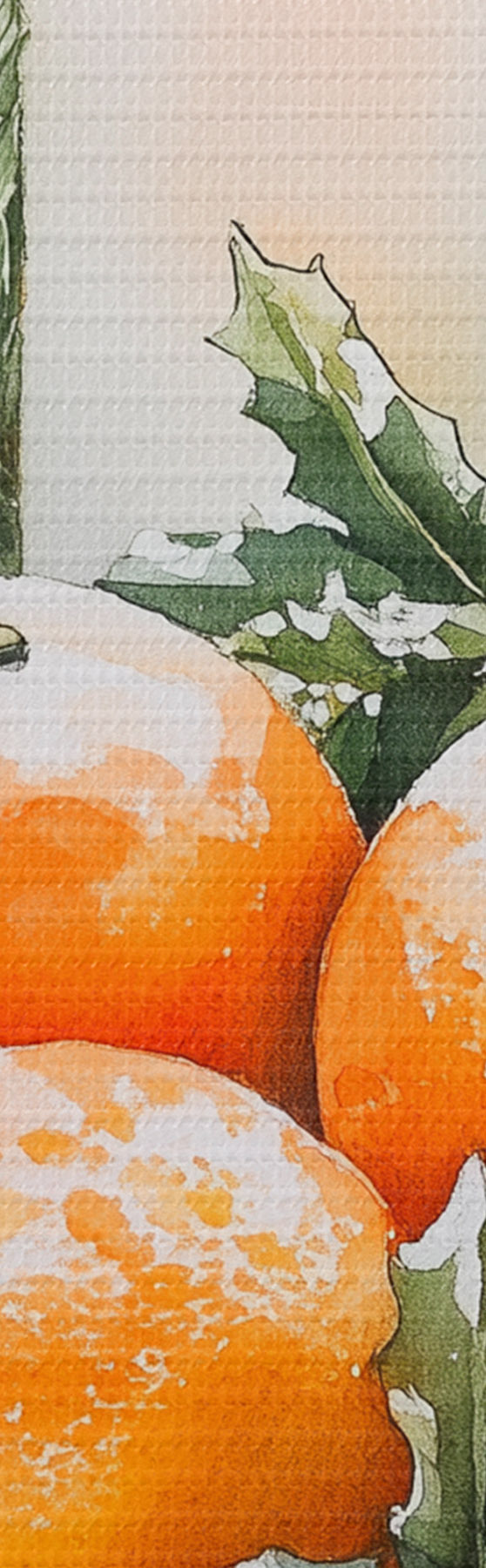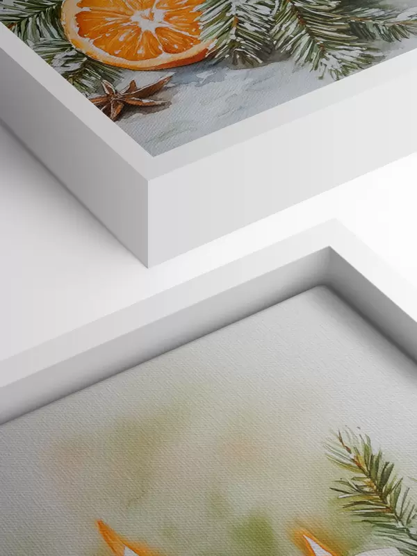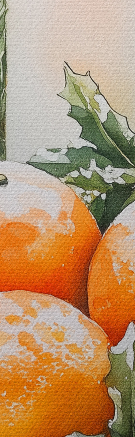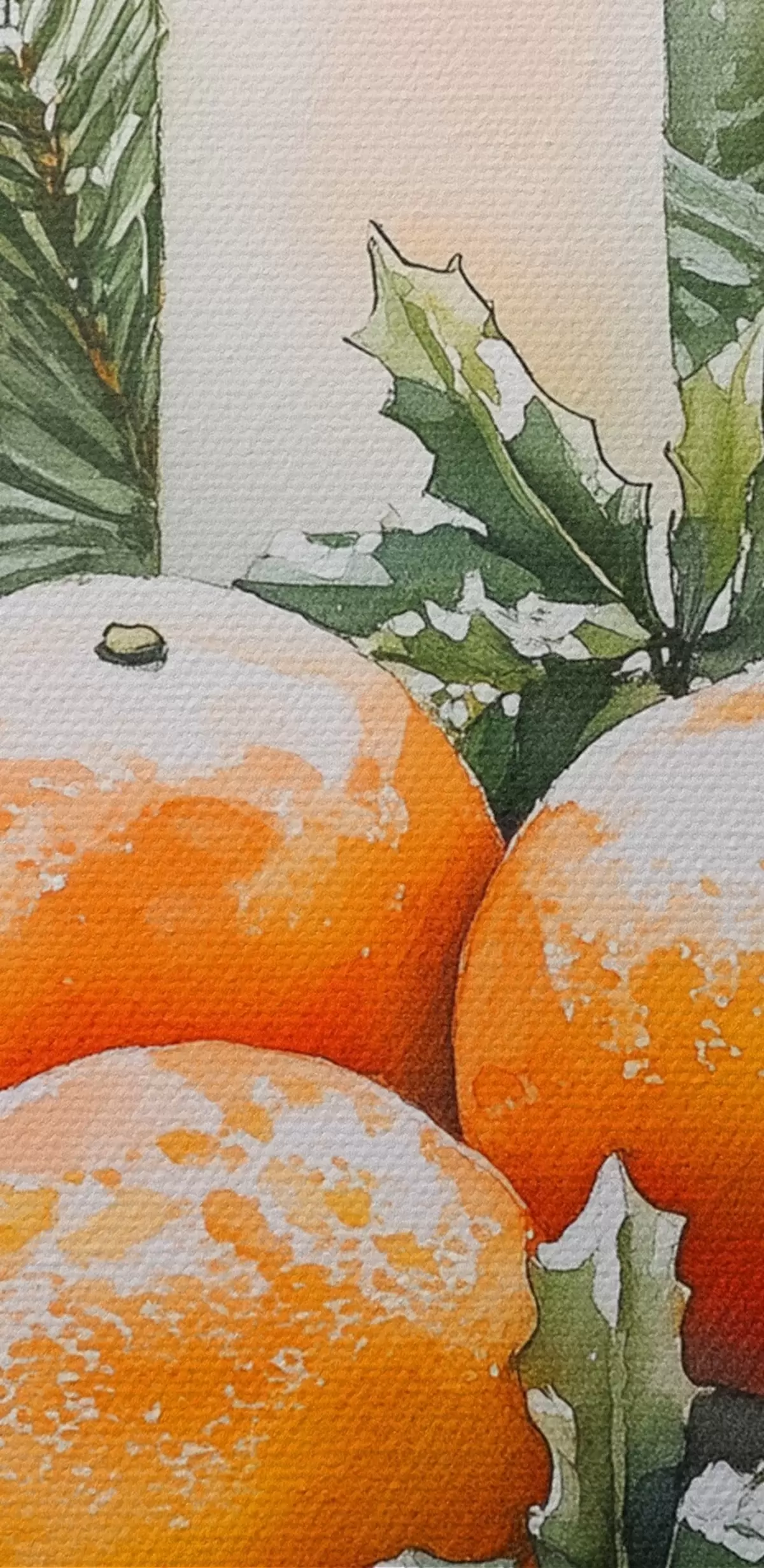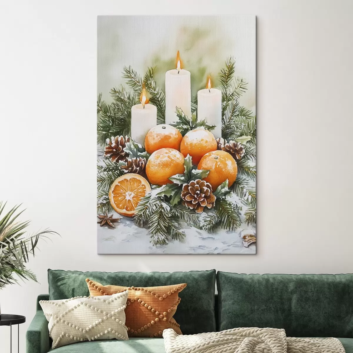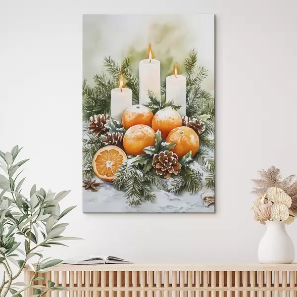 Paveikslas Kalėdinis dekoras su žvakėmis, pušimi, spurgomis ir apelsinais, akvarelės stilius Nr s41951