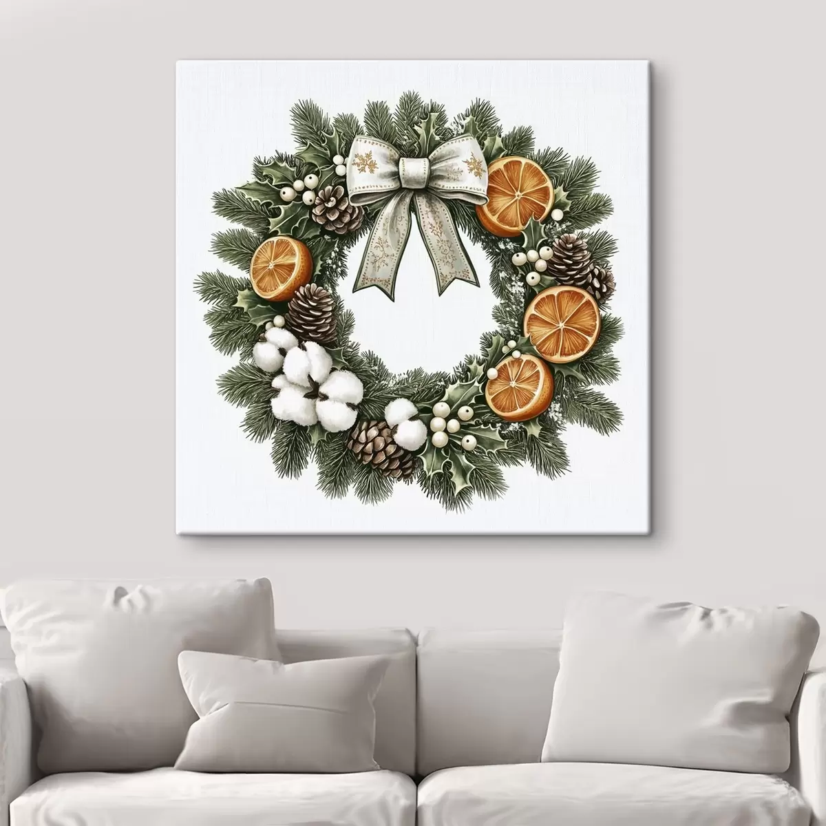 Paveikslas Kalėdų vainikas su medvilne, apelsinais, miško uogomis ir spurgomis, akvarelės stilius Nr s41954