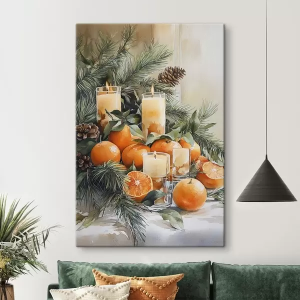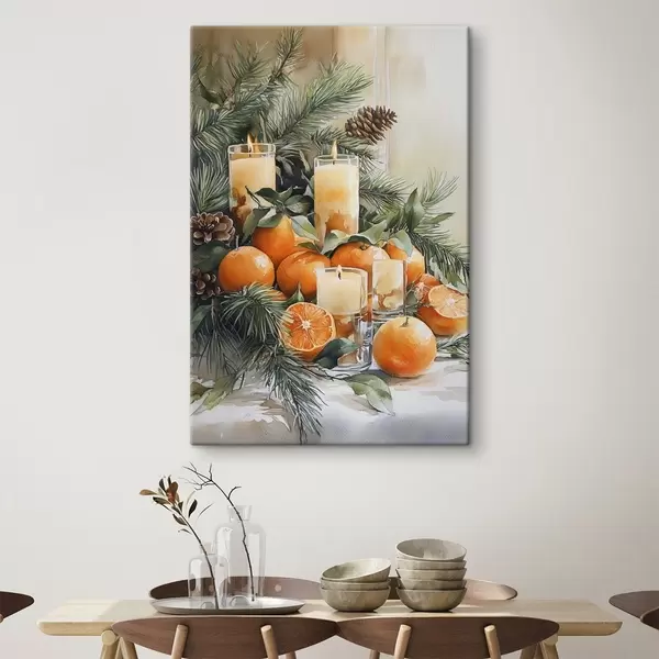 Paveikslas Pušies šakos su spurgomis, apelsinais ir žvakėmis, šventinis, akvarelės stilius Nr s41956