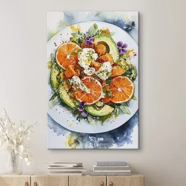 Paveikslas Skanios salotos su apelsinais, fetos sūriu, moliūgais ir avokadais, akvarelinis maistas Nr s41959