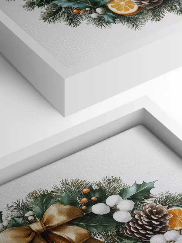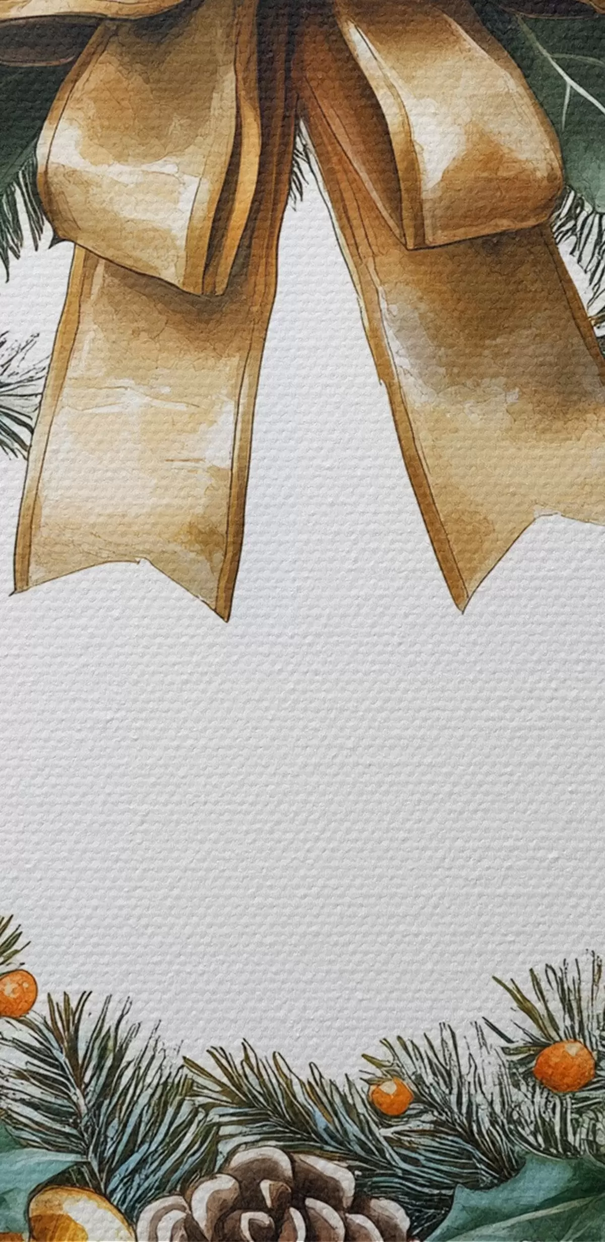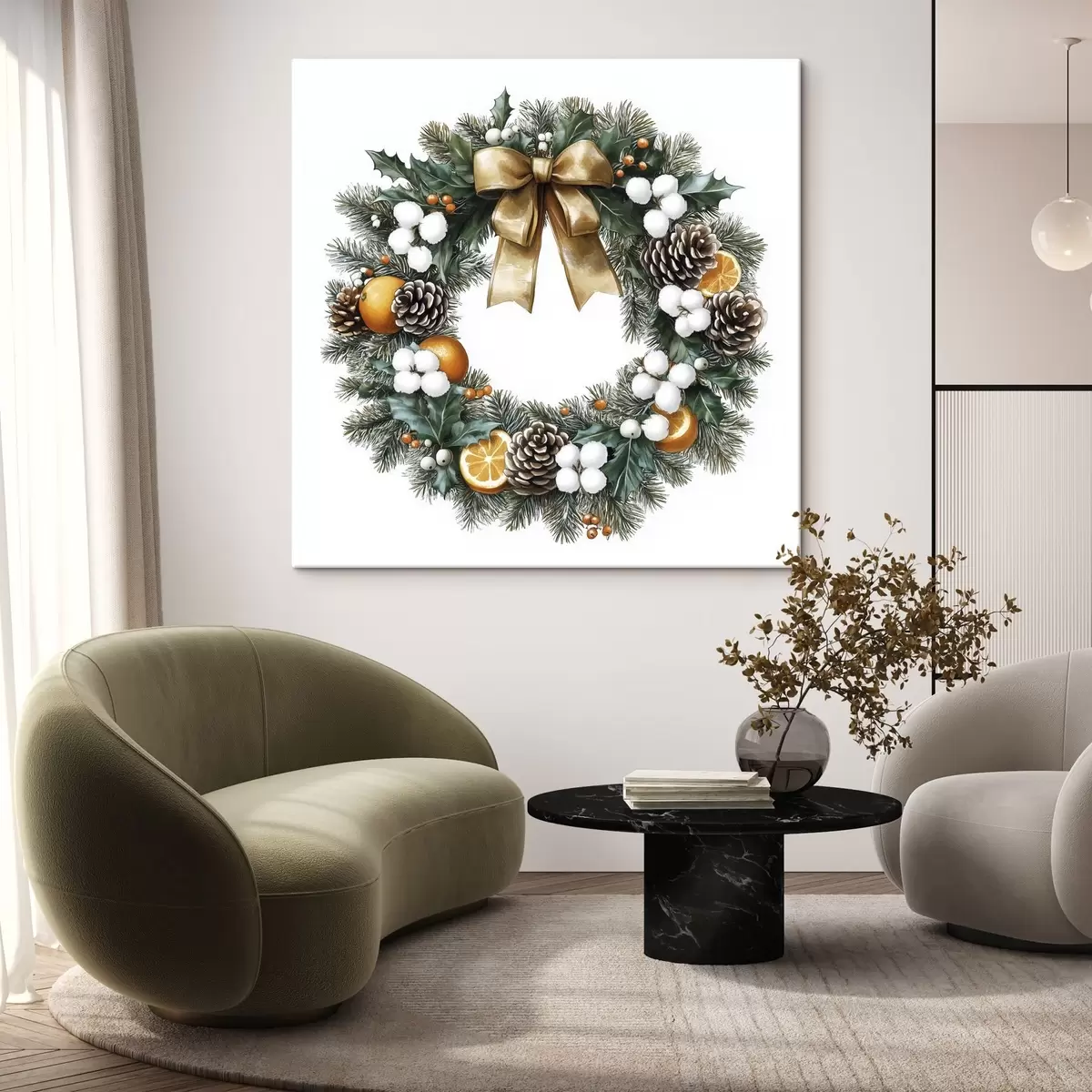 Paveikslas Kalėdinis pušų vainikas su lanku, medvilne, apelsinais, uogomis ir spurgomis Nr s41962