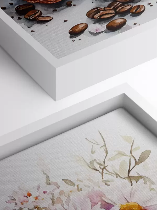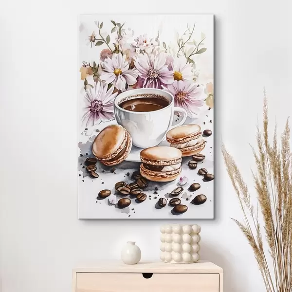 Paveikslas Kavos puodelis su makaronais, rožinės gėlės, akvarelės stilius, kavos pupelės Nr s41963