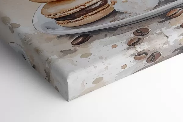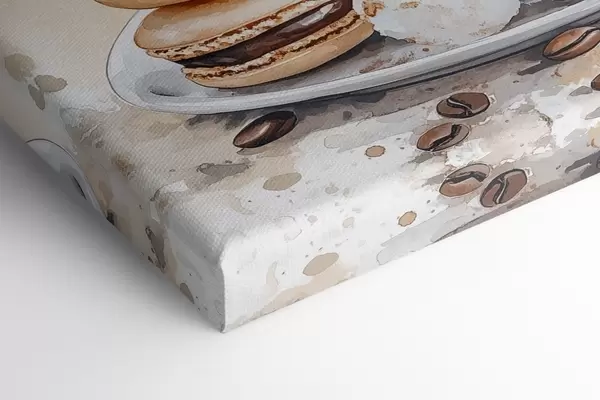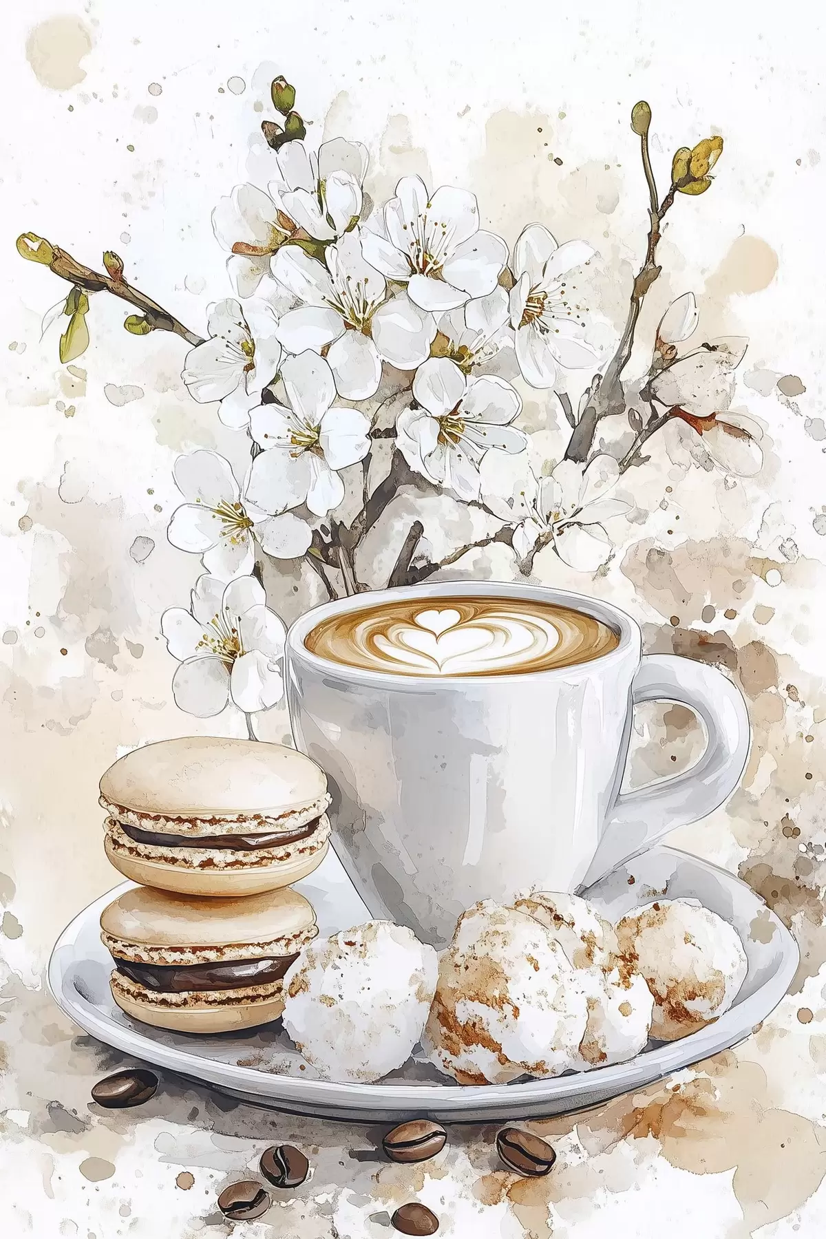 Paveikslas Gražus puodelis kavos, jazminų gėlės, makaronai, švelnios akvarelės spalvos Nr s41964