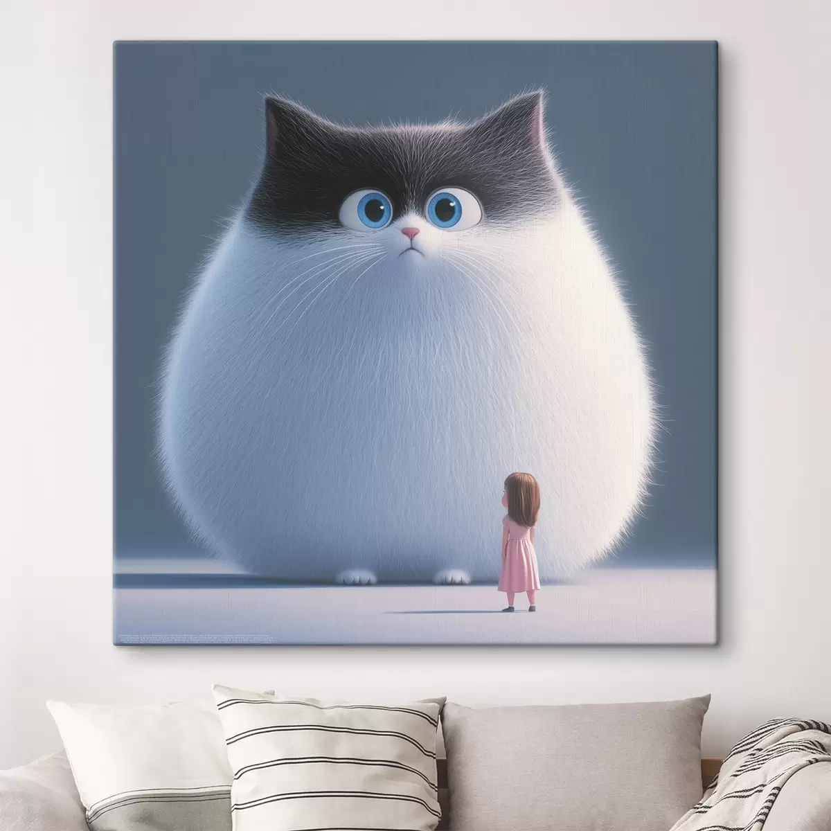 Paveikslas Iliustracijų stiliaus nustebęs pūkuotas katinas su mergaite Nr s41974