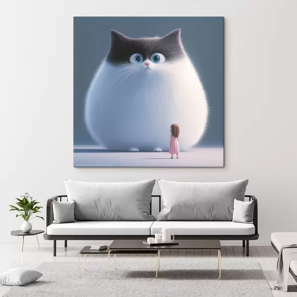 Paveikslas Iliustracijų stiliaus nustebęs pūkuotas katinas su mergaite Nr s41974