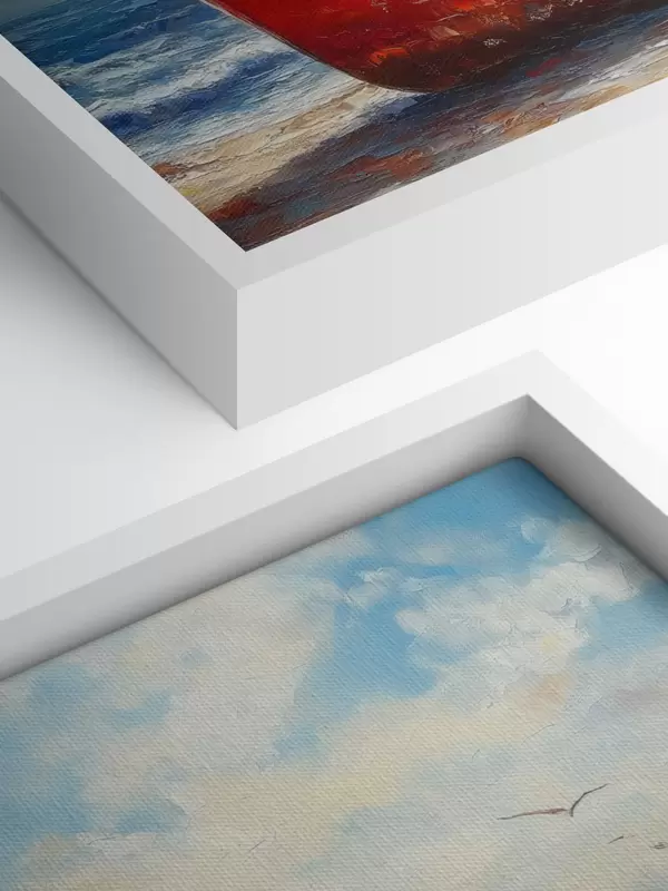 Paveikslas raudona valtis prie jūros aliejinių dažų stiliumi Nr s42009