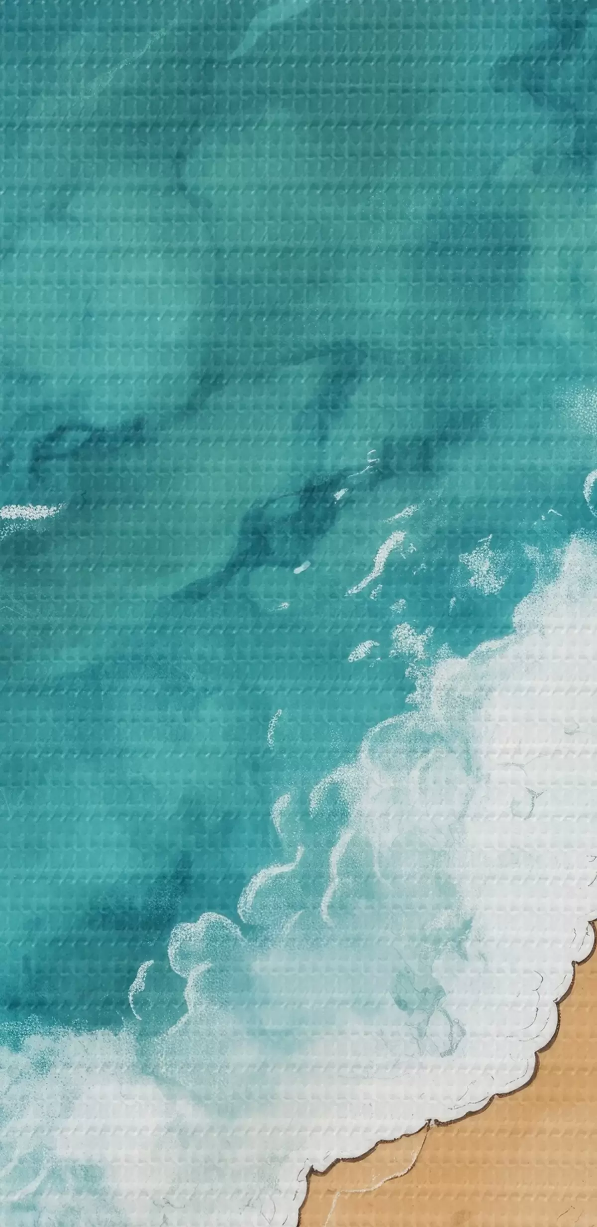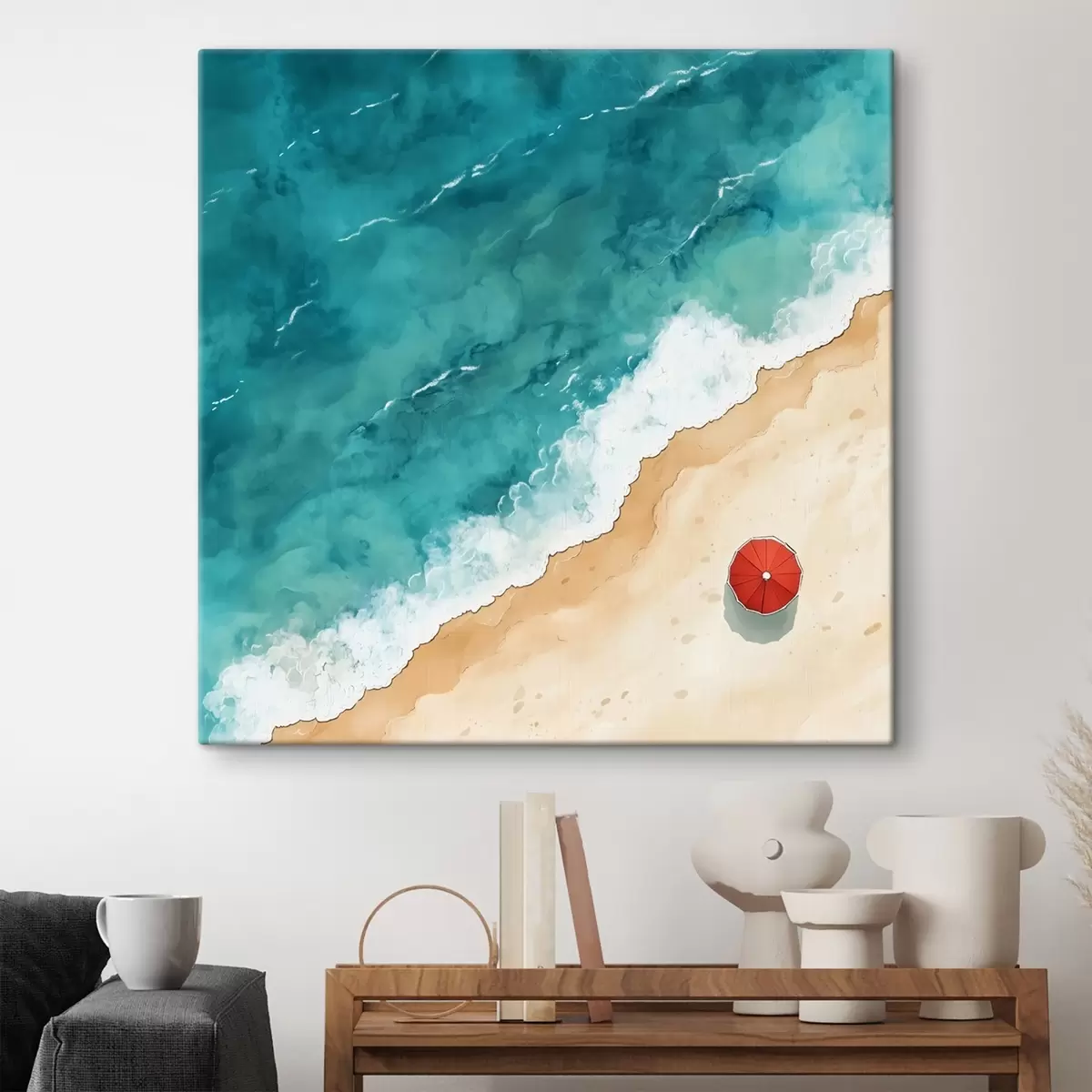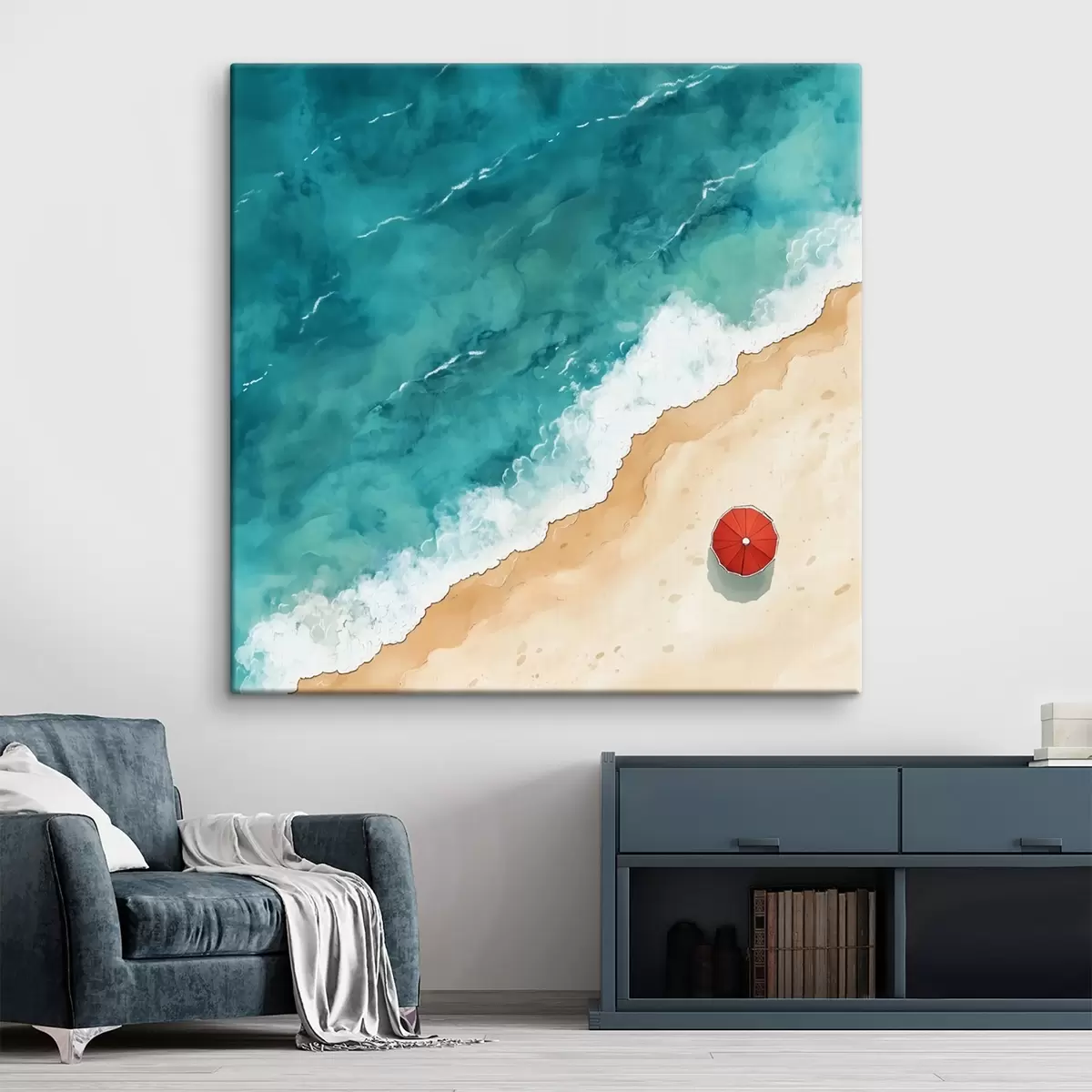 Paveikslas Smėlio paplūdimys su jūra ir raudonu skėčiu, vaizdas iš viršaus Nr s42040