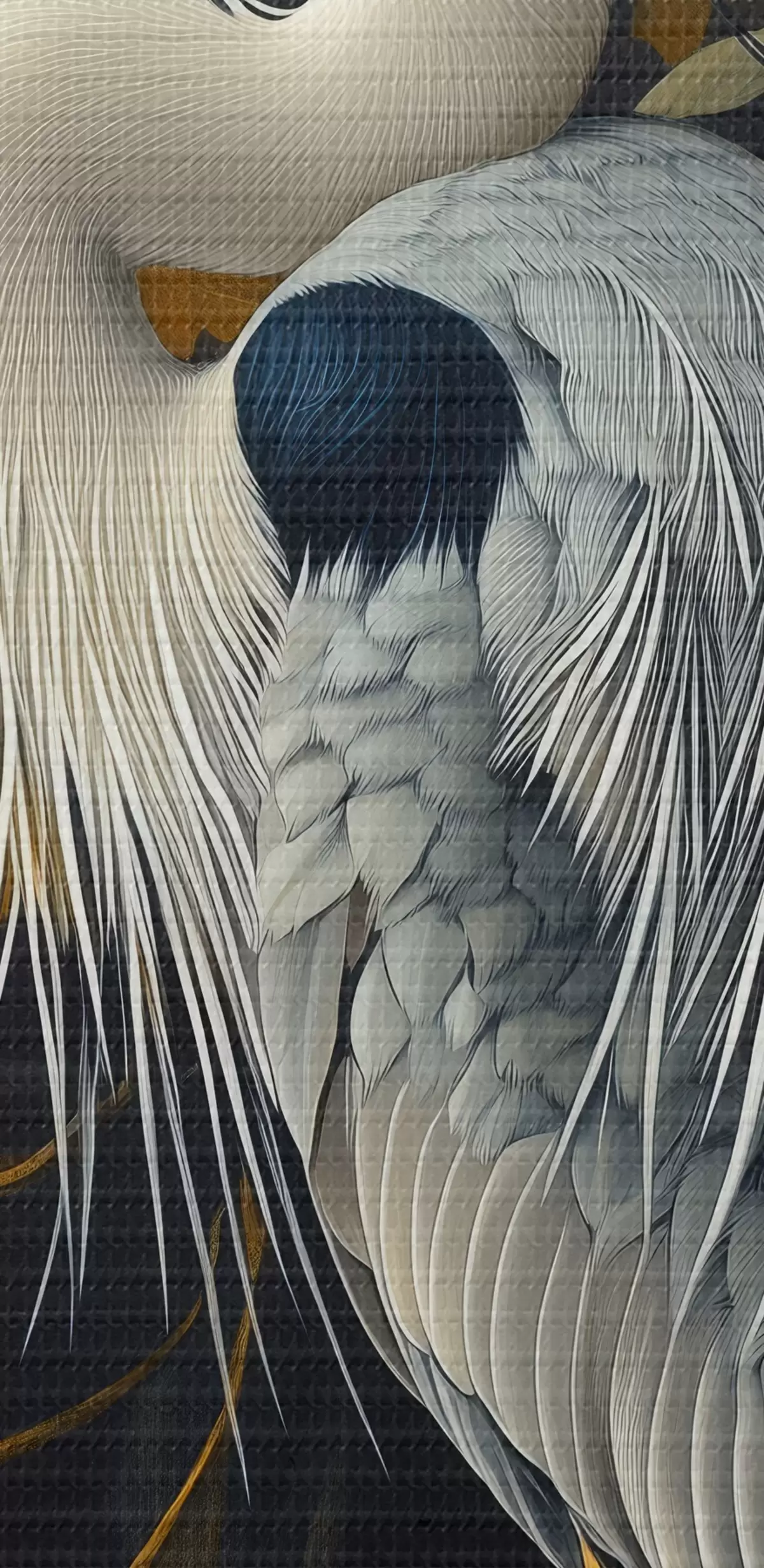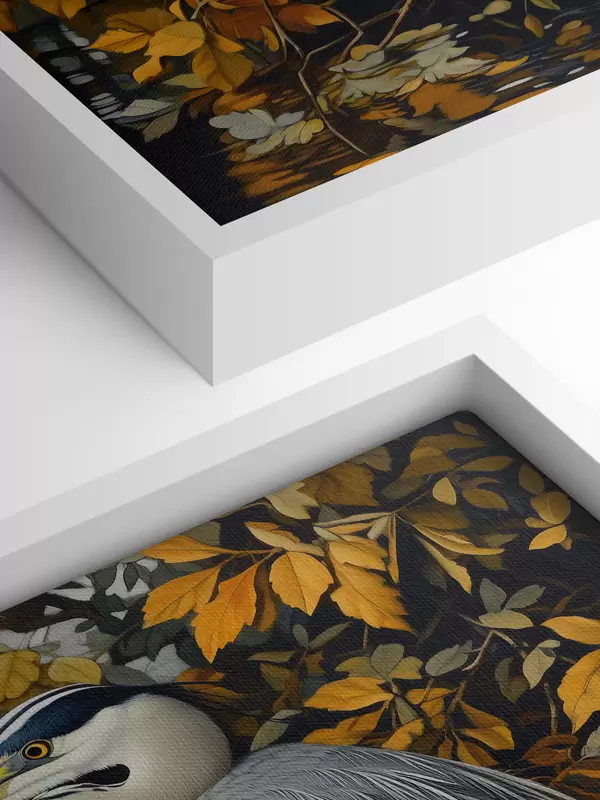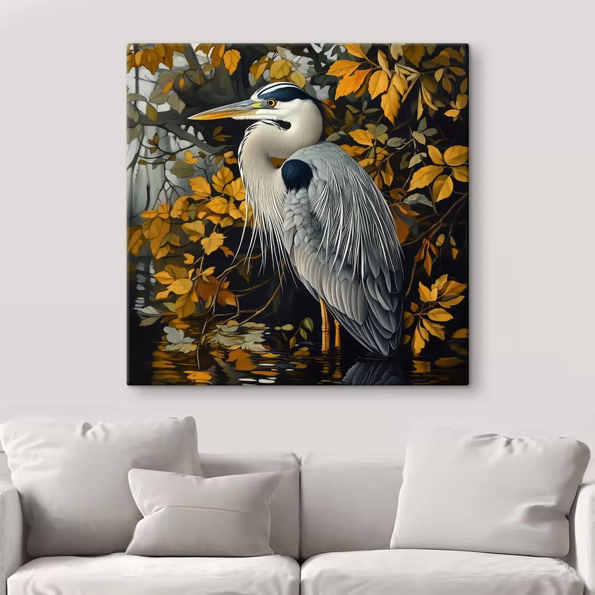 Paveikslas Vandenį skalaujantis garnys rudeninių lapų fone Nr s42041