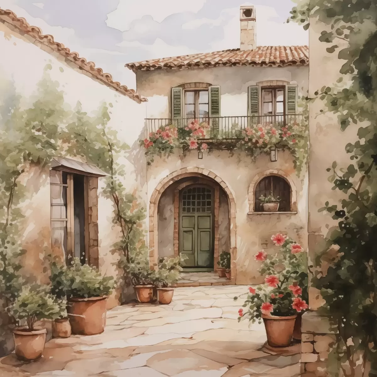 Paveikslas Itališkas kiemas su akvarelės imitacijos vazonais Nr s42126