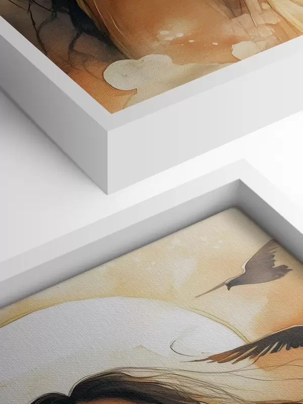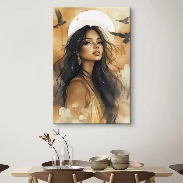Paveikslas Moteris su skraidančiais paukščiais, genties, smėlio spalvos, saulė Nr s42196