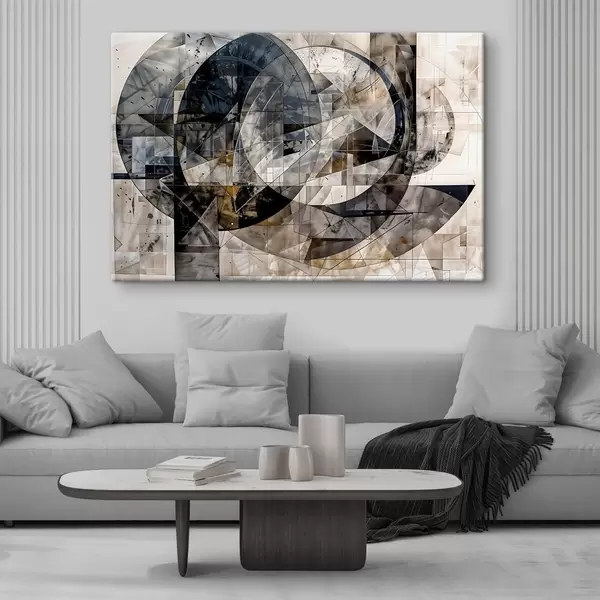 Paveikslas Abstrakti šiuolaikinė geometrinė kompozicija su persidengiančiomis formomis ir pilkų, juodų ir smėlio atspalvių spauda Nr s42212