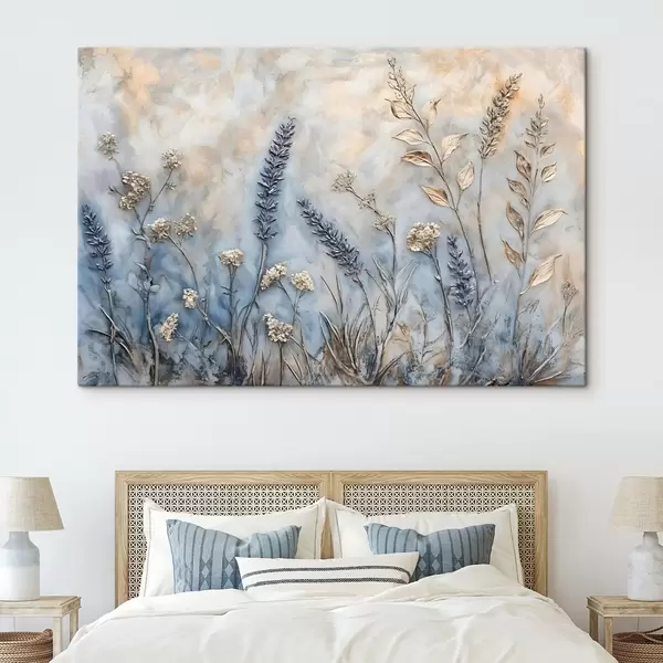 Paveikslas Mėlynos, baltos ir smėlio spalvos įvairių laukinių gėlių ir augalų laukas švelniame, miglotame fone Nr s42214