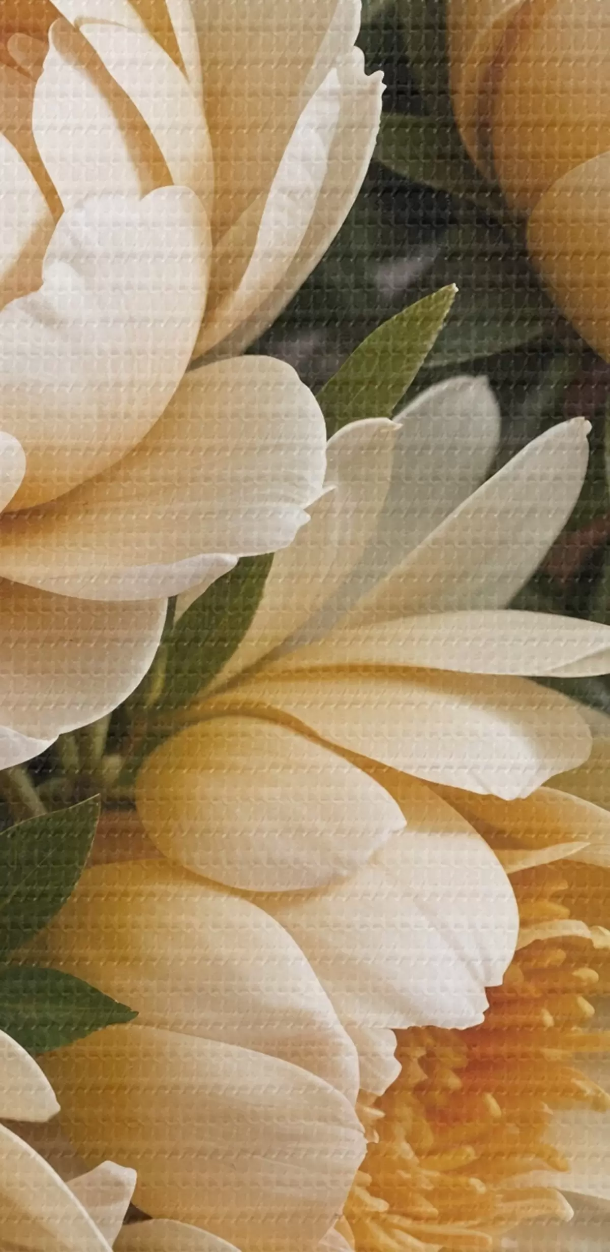 Paveikslas Kreminės spalvos detalūs bijūnų žiedai su tamsiai žaliais lapais pilkame fone Nr s42215