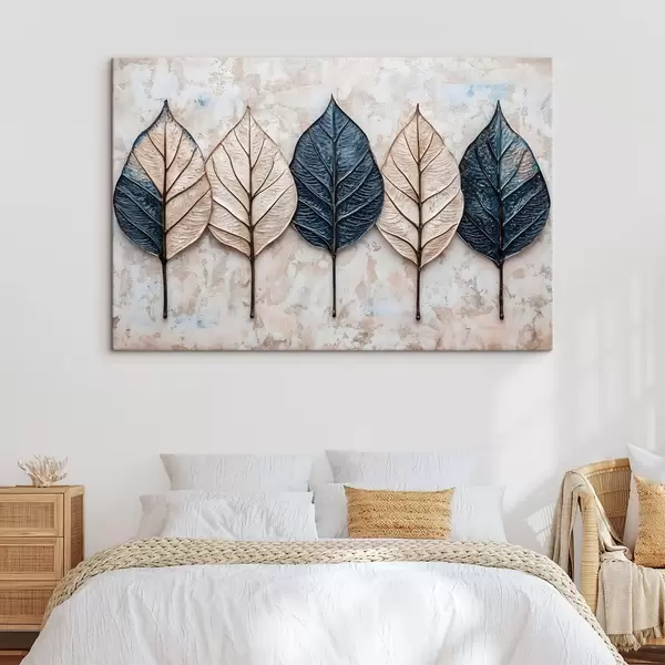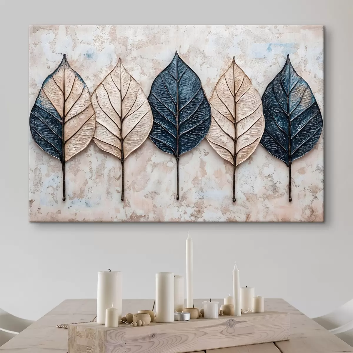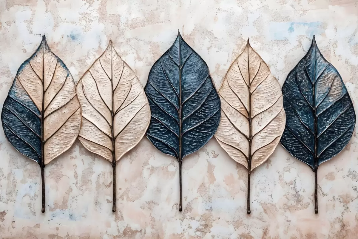 Paveikslas Įvairių rudų, smėlio ir mėlynų atspalvių rudeniniai abstraktūs lapai, surikiuoti į eilę šviesiame fone Nr s42217