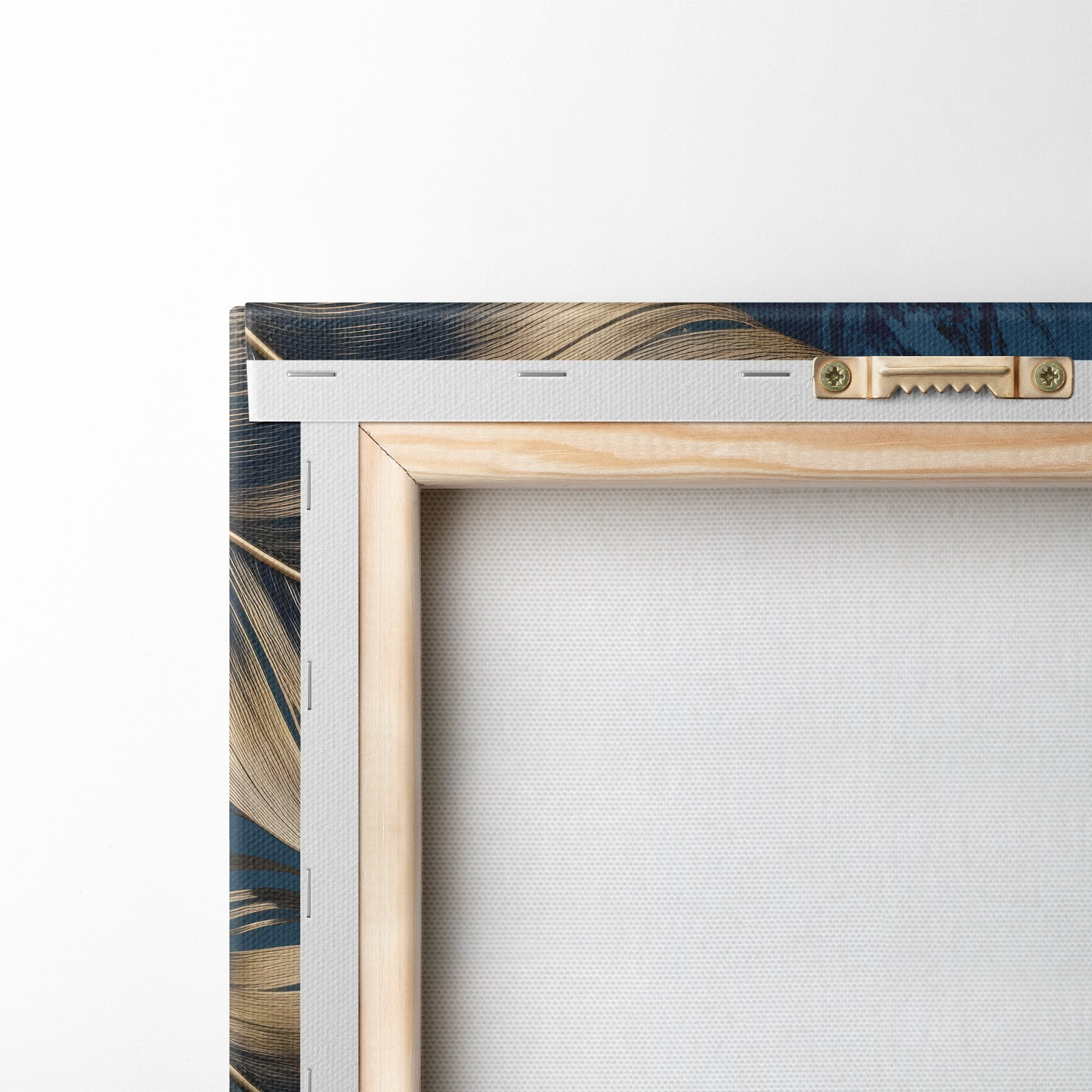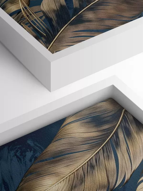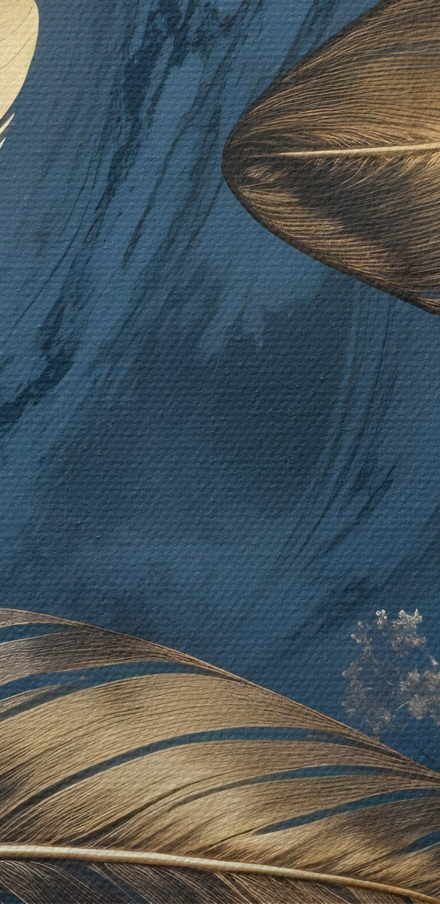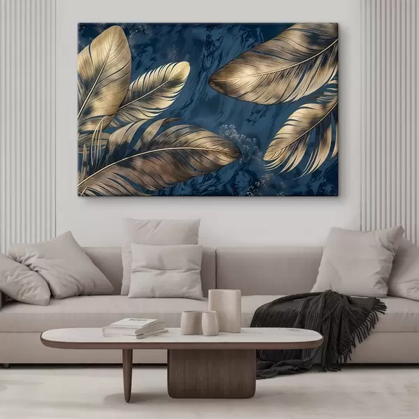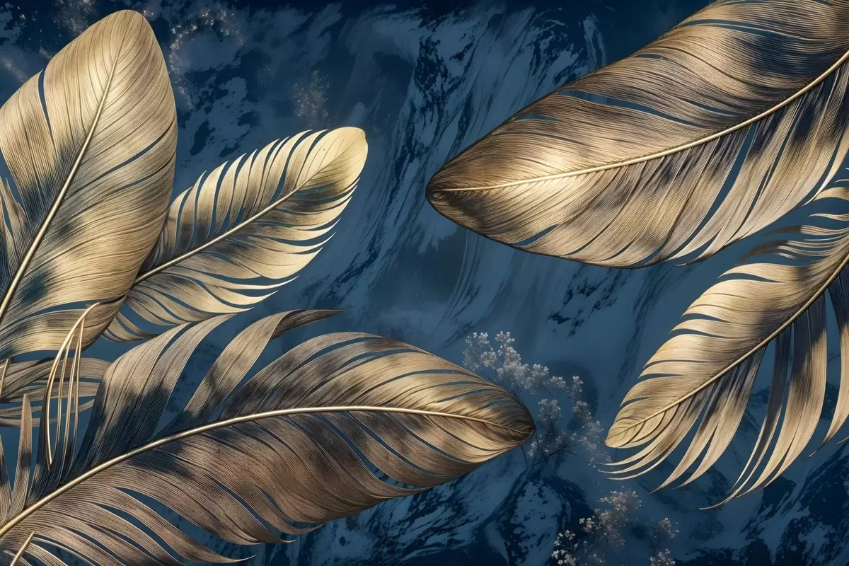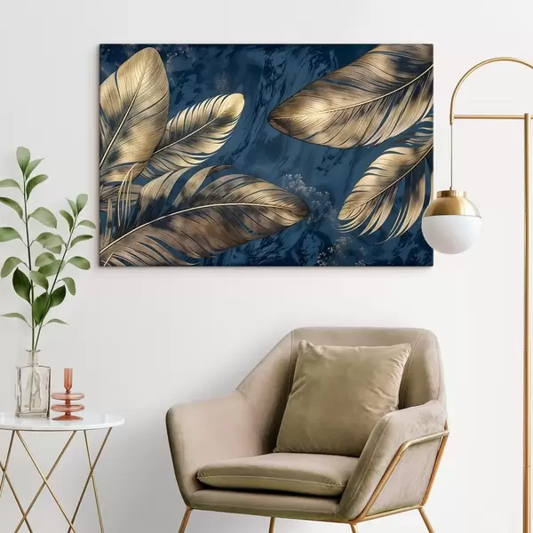 Paveikslas Geltonos ir smėlio spalvos abstrakčios dekoratyvinės plunksnos, plūduriuojančios tamsiai mėlyname tekstūriniame fone Nr s42218