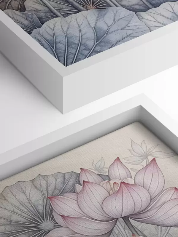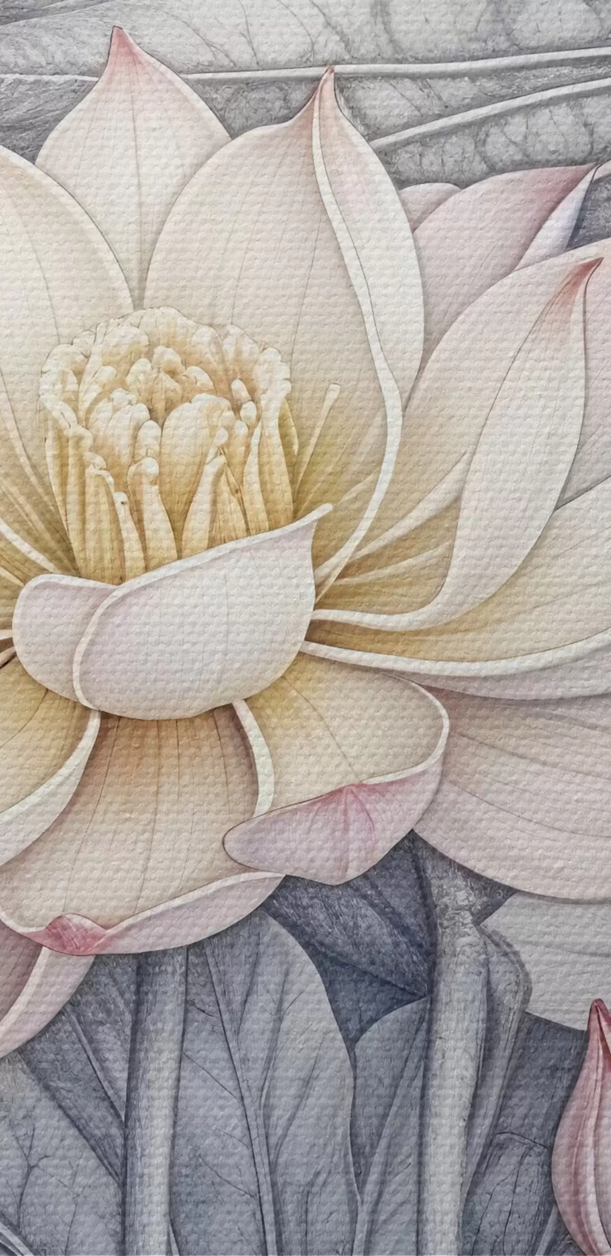 Paveikslas Didelės rausvos ir baltos lotoso gėlės su žaliais lapais ir stiebais šviesiame fone su detaliais žiedlapiais ir centrais Nr s42221