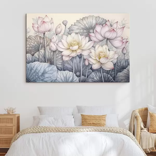 Paveikslas Didelės rausvos ir baltos lotoso gėlės su žaliais lapais ir stiebais šviesiame fone su detaliais žiedlapiais ir centrais Nr s42221