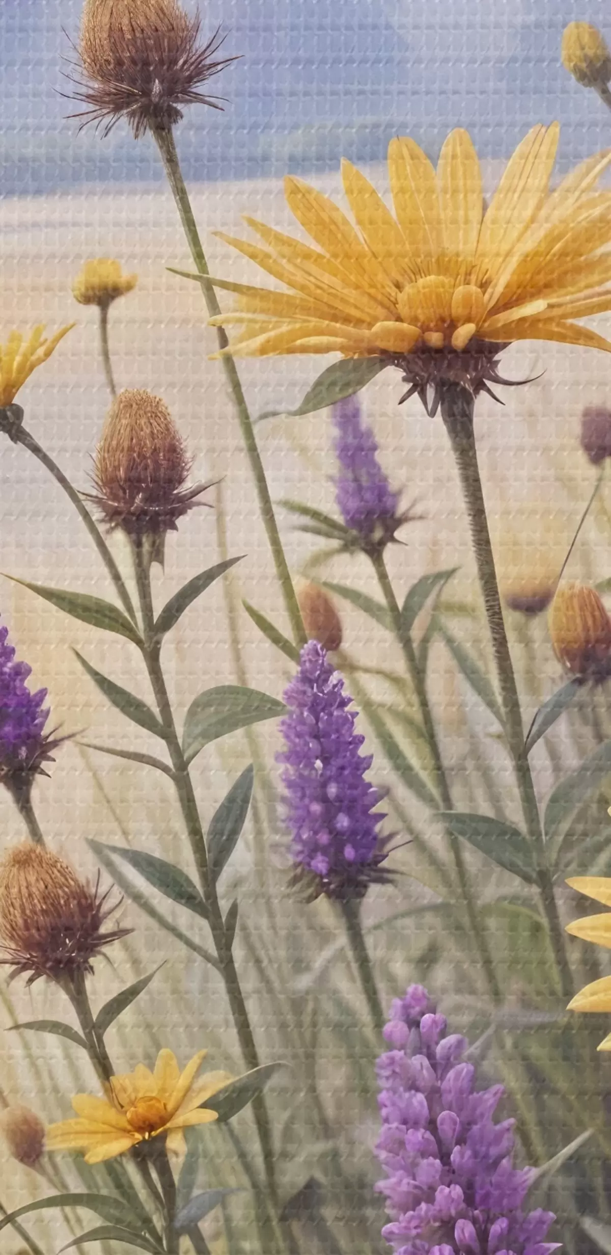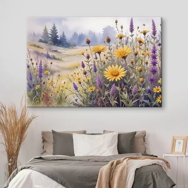 Paveikslas Geltonų saulėgrąžų ir violetinių laukinių gėlių laukas miglotame miško kraštovaizdyje su pušimis fone Nr s42223