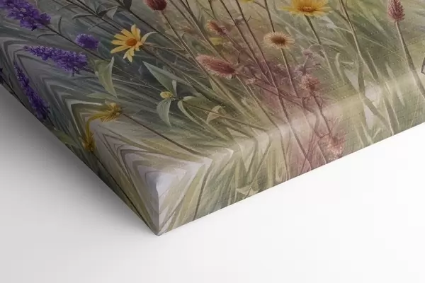 Paveikslas Geltonų saulėgrąžų ir violetinių laukinių gėlių laukas miglotame miško kraštovaizdyje su pušimis fone Nr s42223