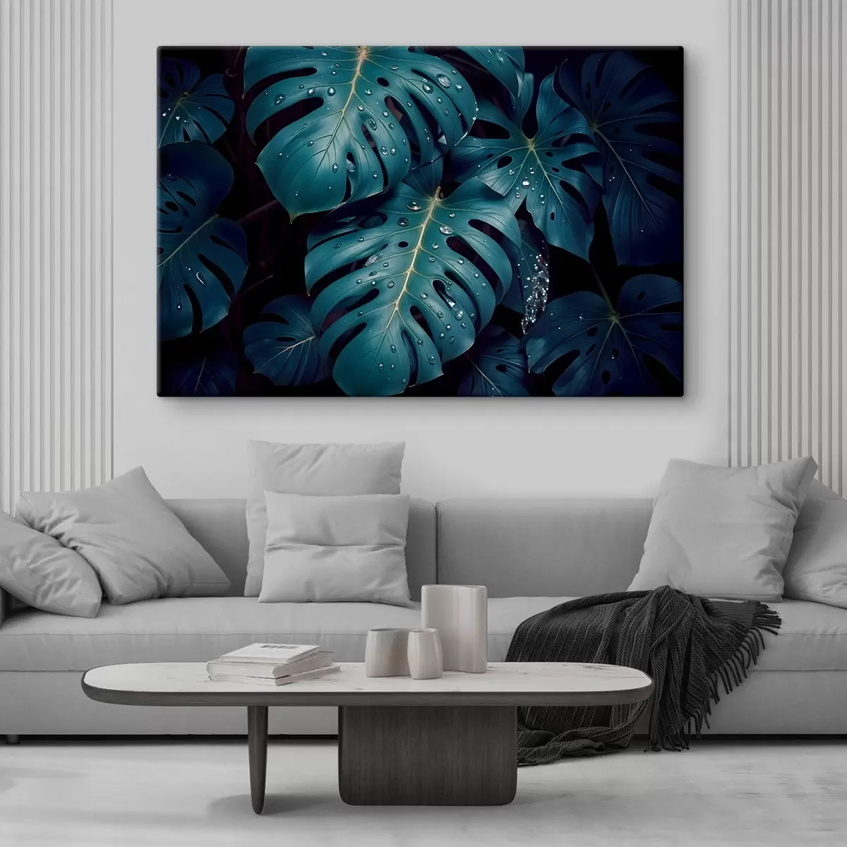 Paveikslas Gausūs atogrąžų monsteros lapai su vandens lašeliais tamsiame fone, sukuriantys nuotaikingą ir atmosferišką atspaudą Nr s42233