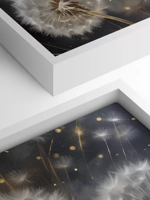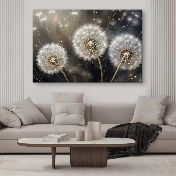 Paveikslas Kiaulpienių žiedai su puriomis baltomis sėklų galvutėmis tamsiame fone sukuria magišką atmosferą Nr s42235