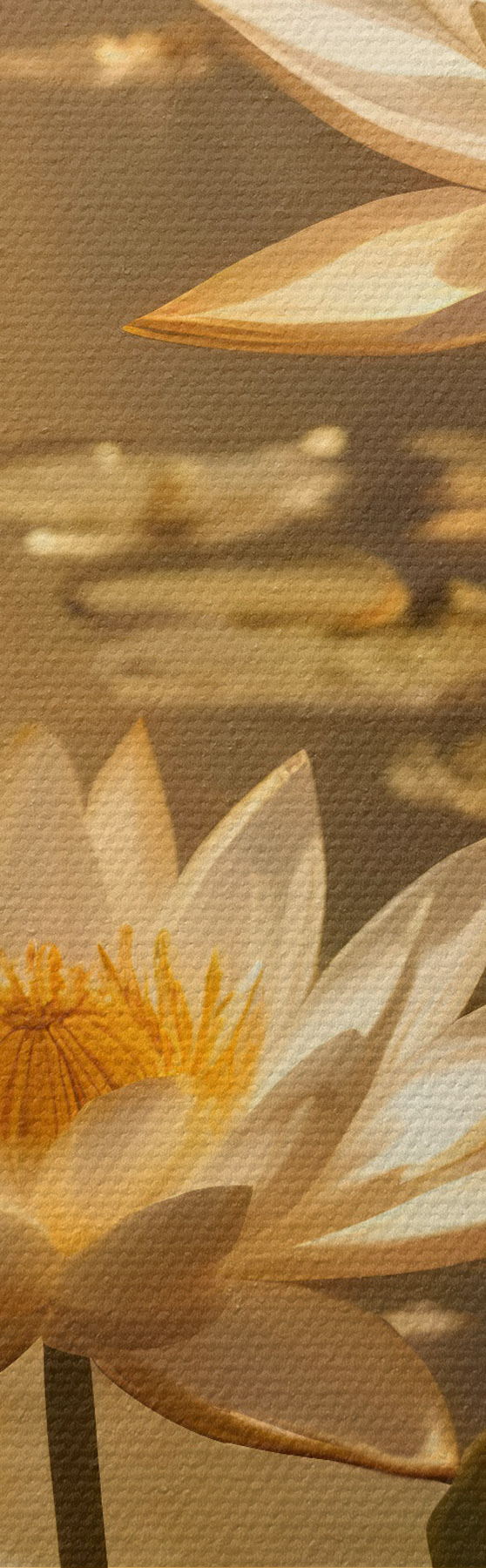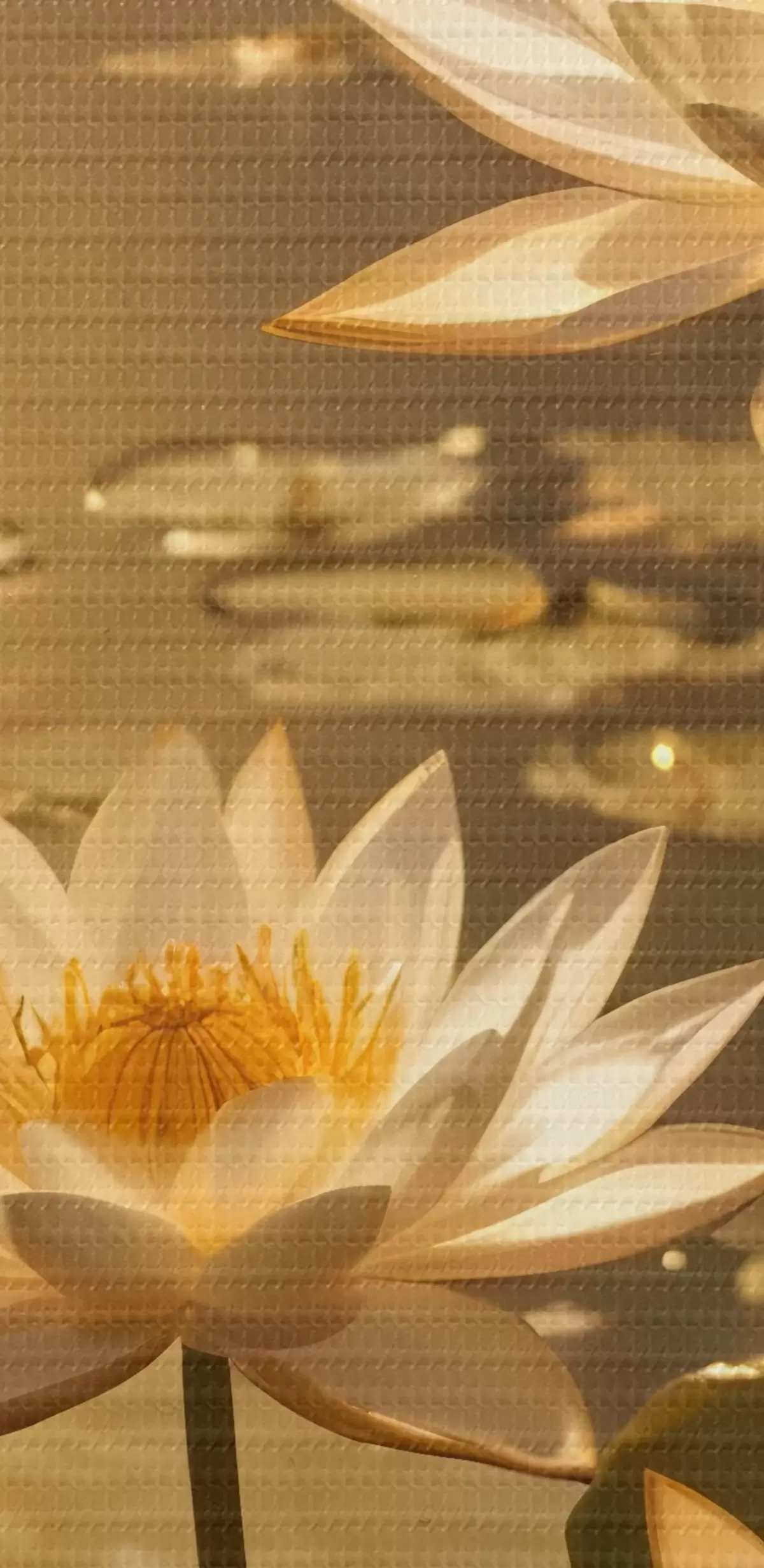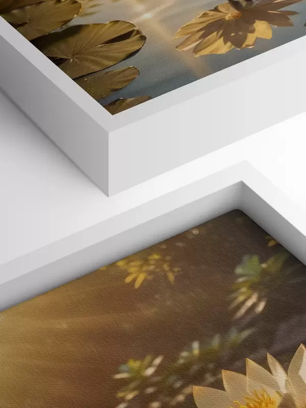 Paveikslas Balti lotoso žiedai plūduriuoja ramiame tvenkinyje su saule, sukurdami giedrą ir ramią atmosferą Nr s42239