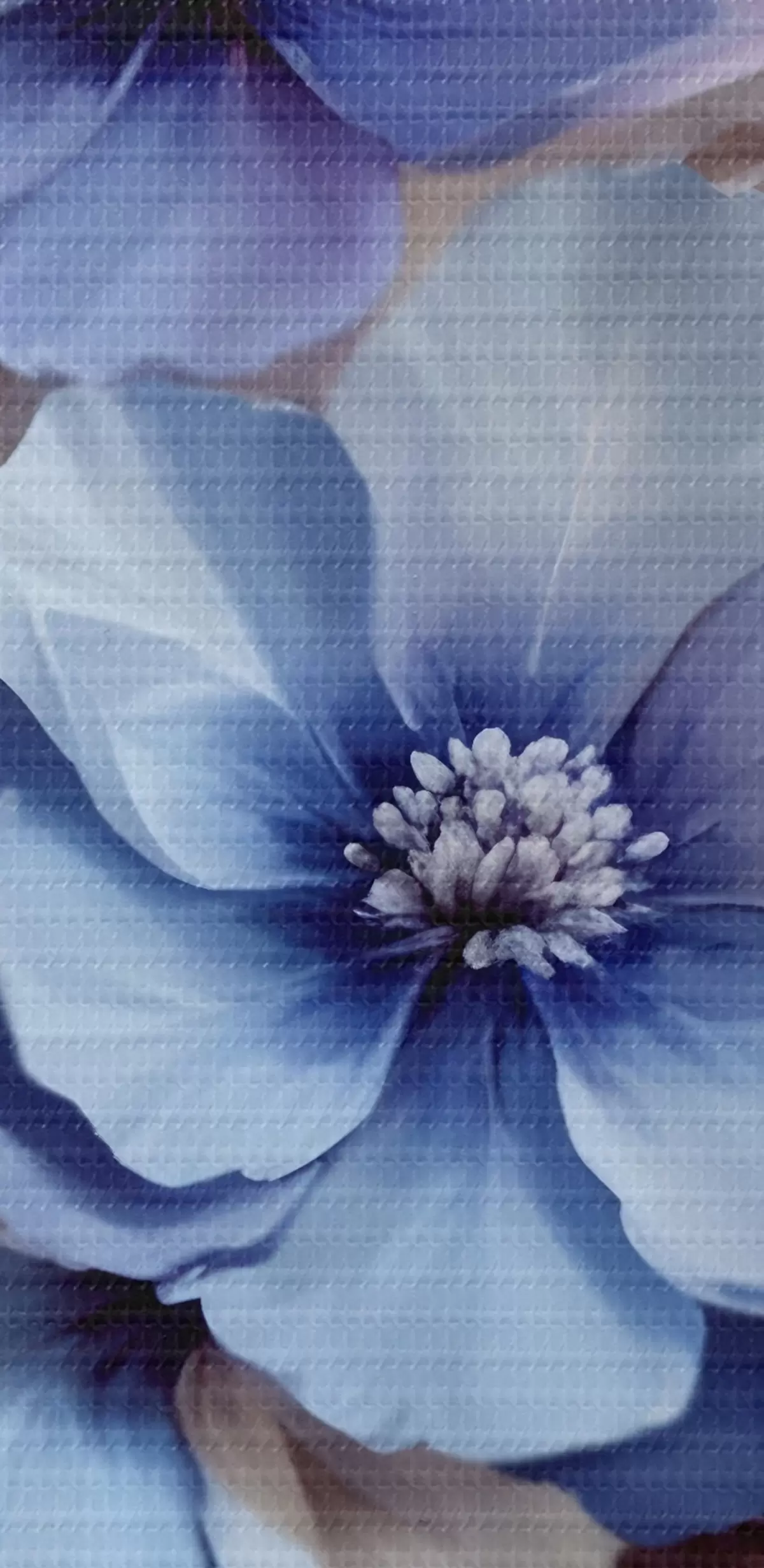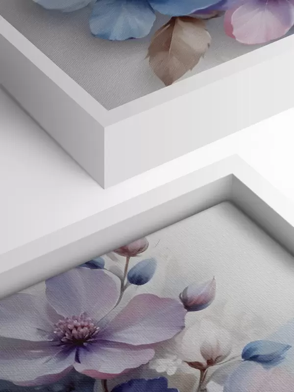 Paveikslas Švelnios mėlynos ir rožinės spalvos gėlės su minkštais žiedlapiais ir centrais, išdėstytos gražiu gėlių raštu šviesiame fone Nr s42241